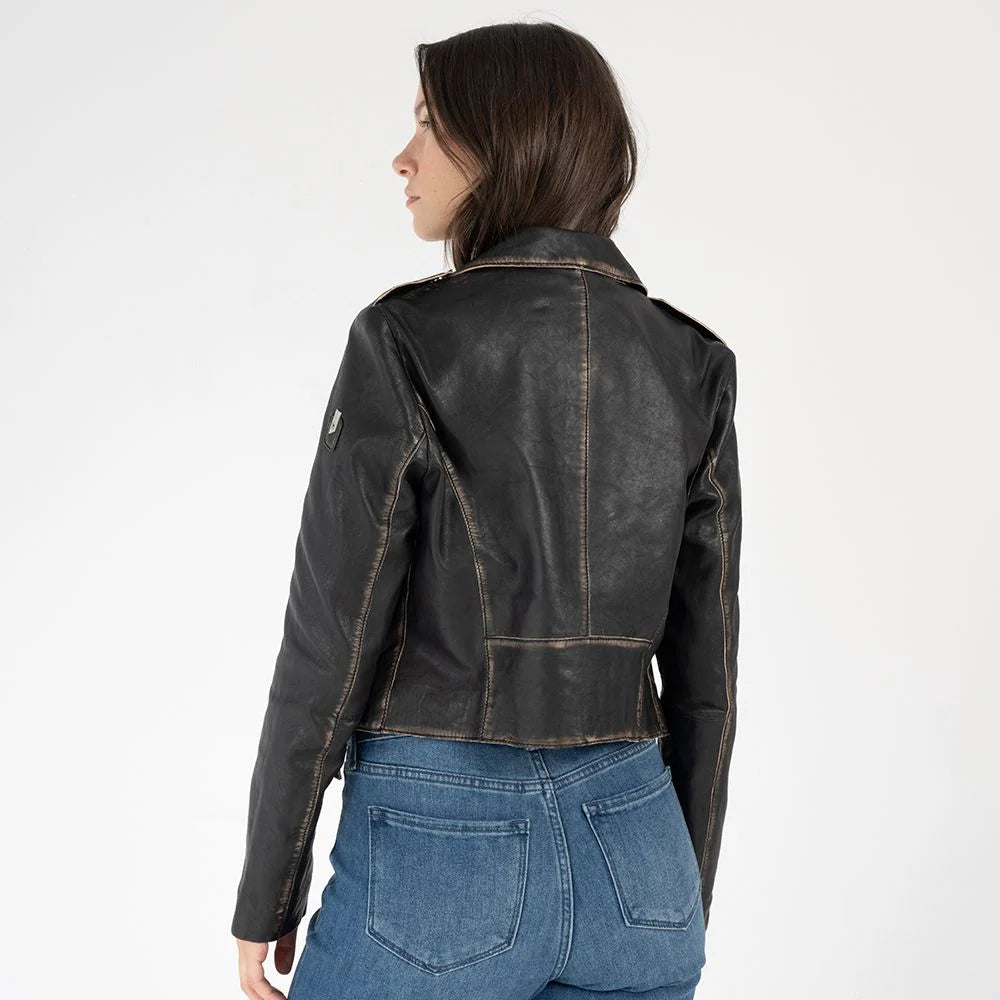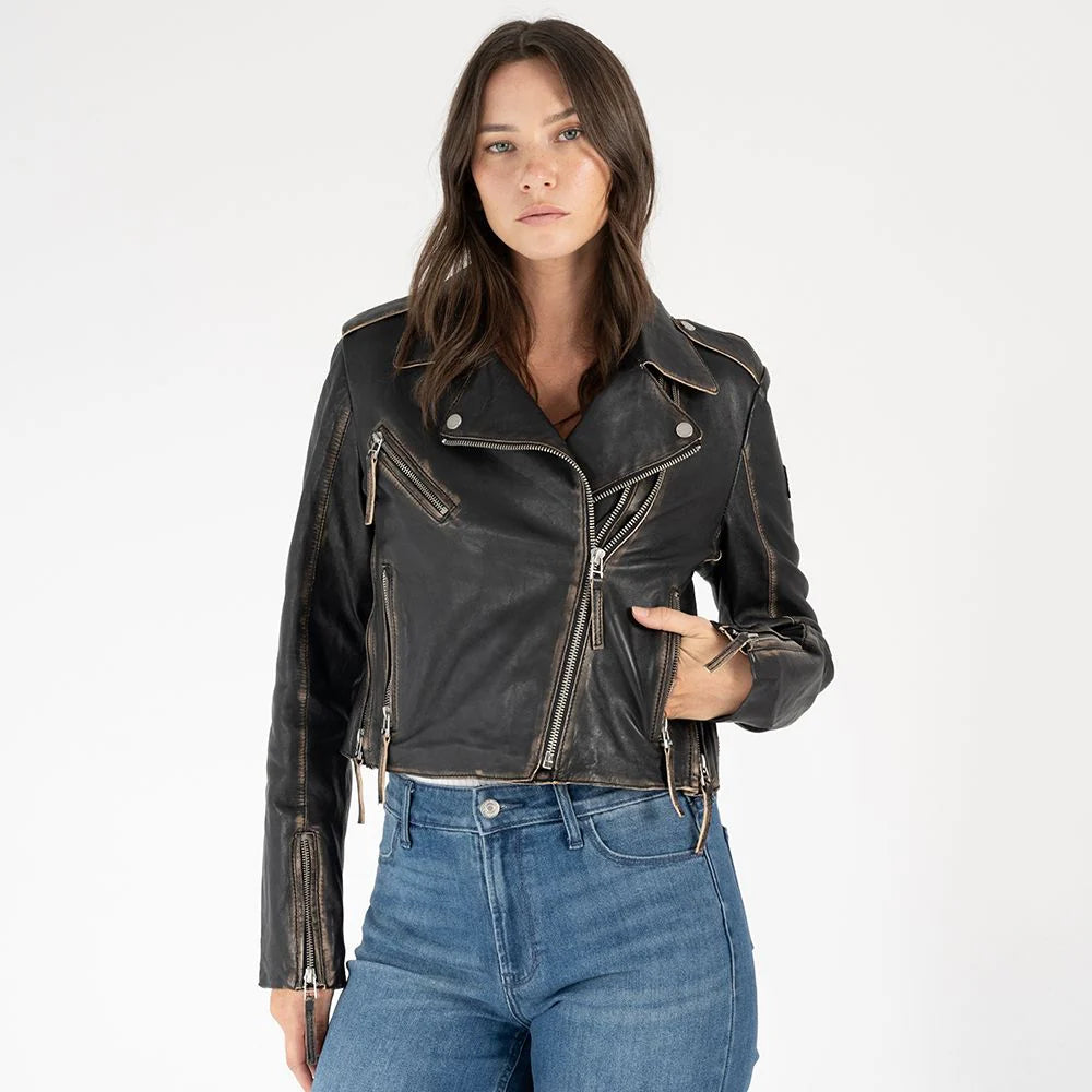 Expertly crafted for a vintage feel, Sharon showcases polished seams for a distressed look. This cropped moto jacket exudes a timeless and edgy style that will elevate any outfit.