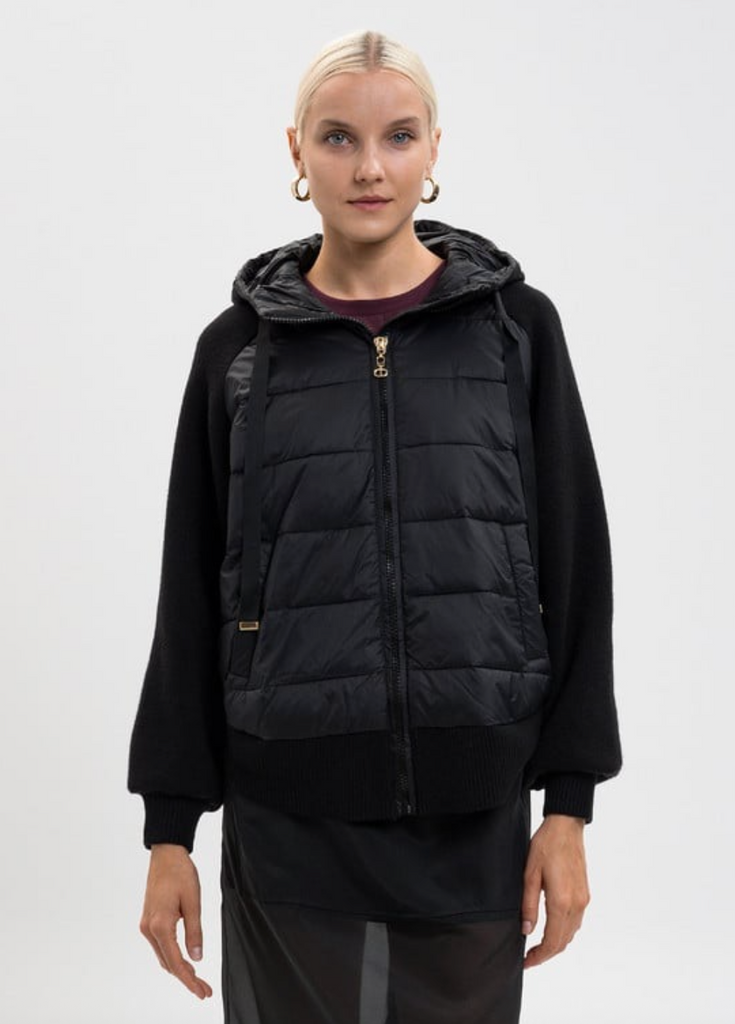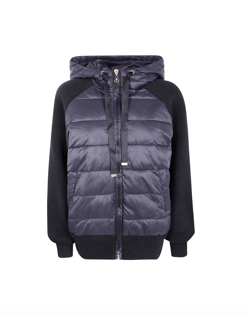 Padded jacket with drawstring hood, knitted details, zip fastening, Oval T zip puller and ribbed finishes.