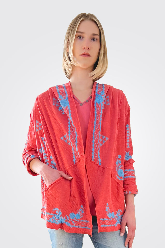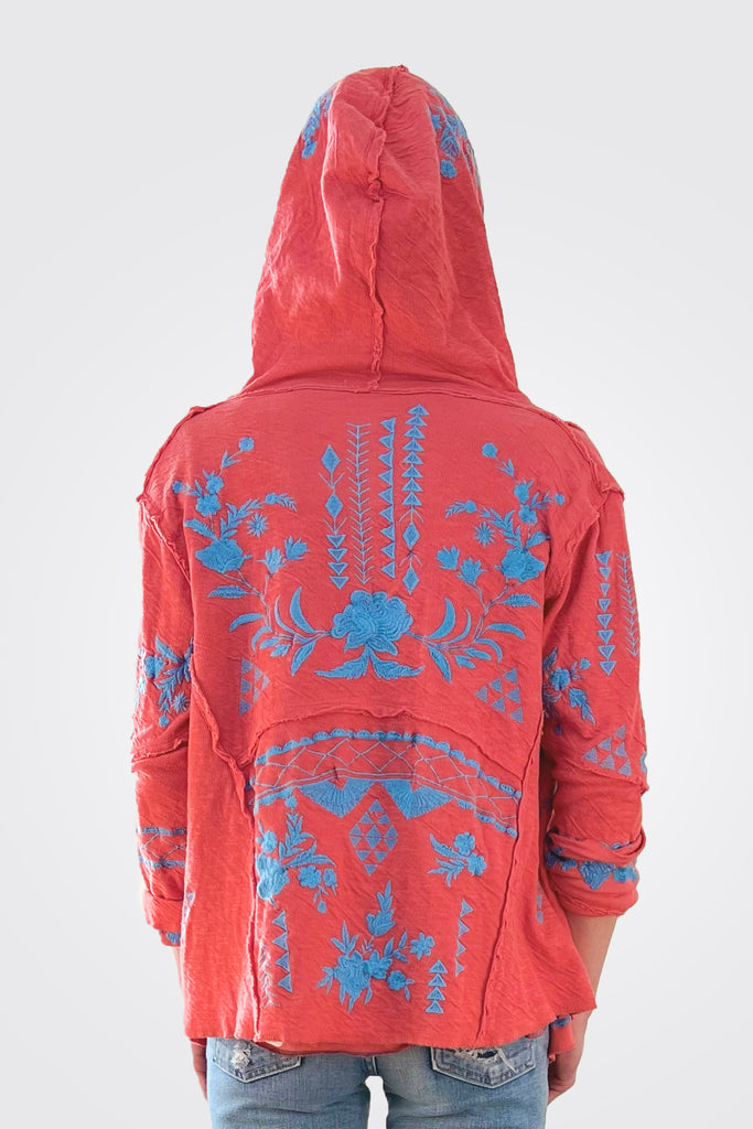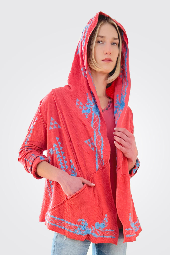 With a vintage inspired embroidery, the Sia Jacket features long sleeves, hood, and pockets.