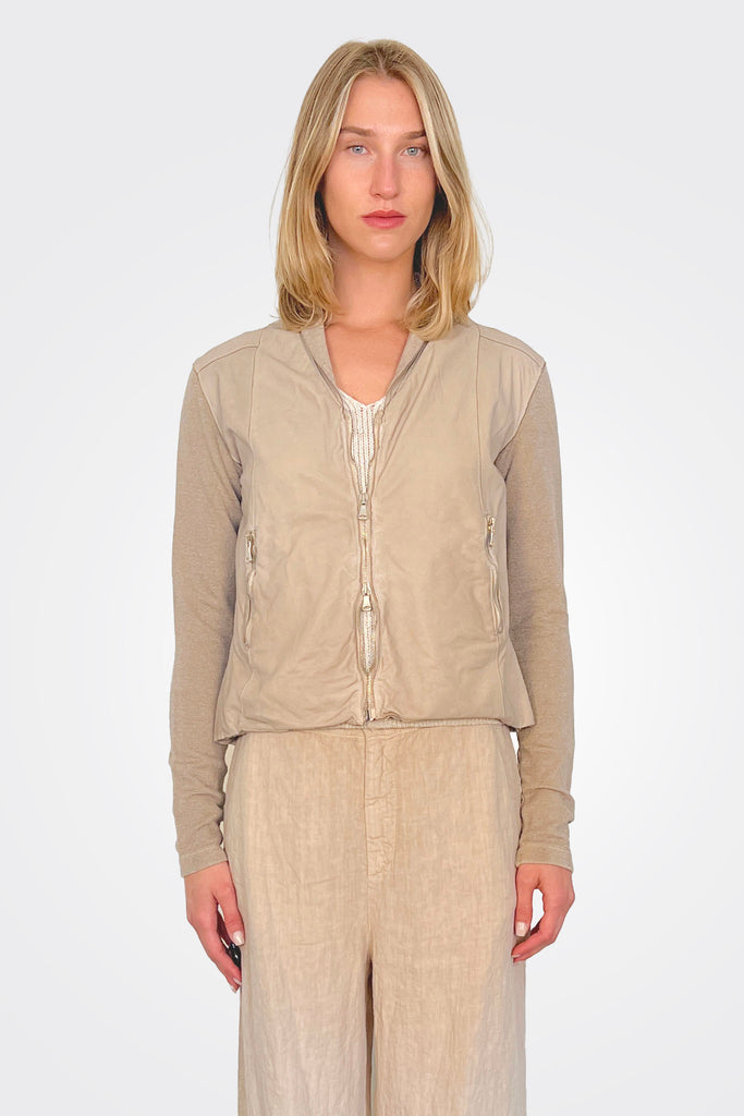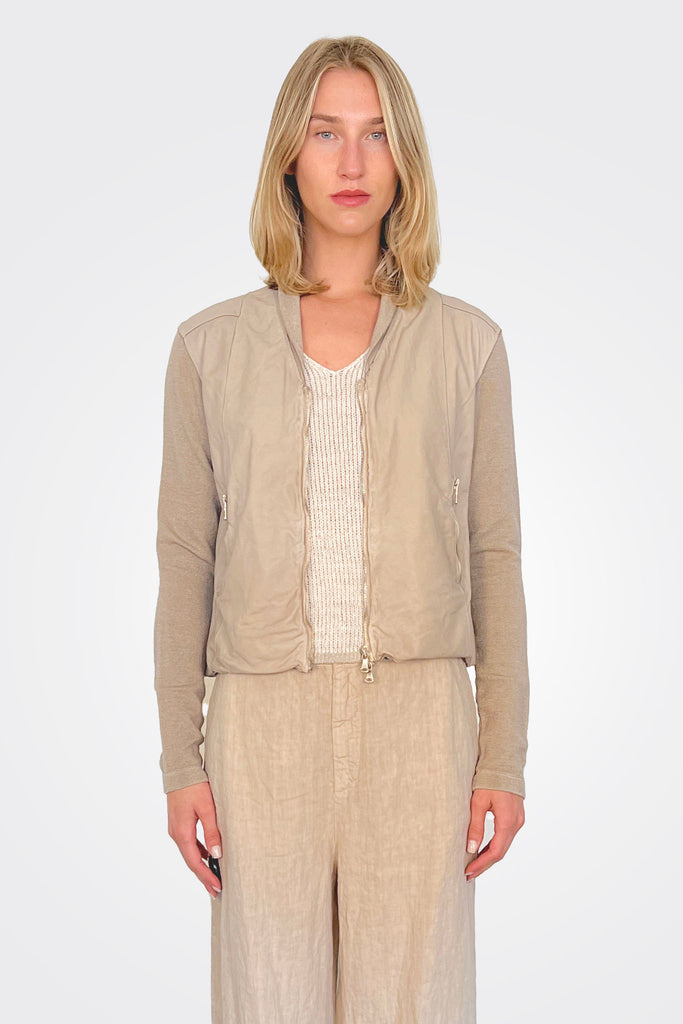 Slim-fit, unlined waist-length short jacket with zip fastening at the front and zip pockets. Knitted inserts on the sleeves and sides. Garment dyed. | CFDTRZ2372-02