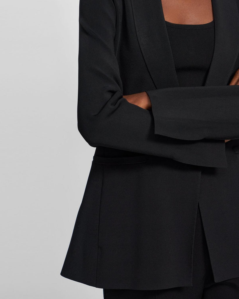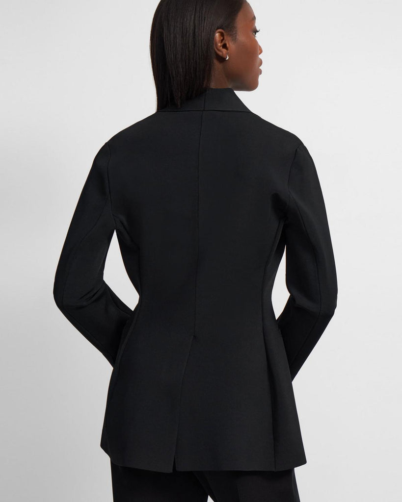A Theory favorite, Etiennette blazer is reimagined in signature glossed stretch knit. Designed in a strong, feminine silhouette with peak lapels, a cutaway front, and a flattering nipped-in waist, it’s a versatile style that works from day to night, week to weekend.