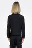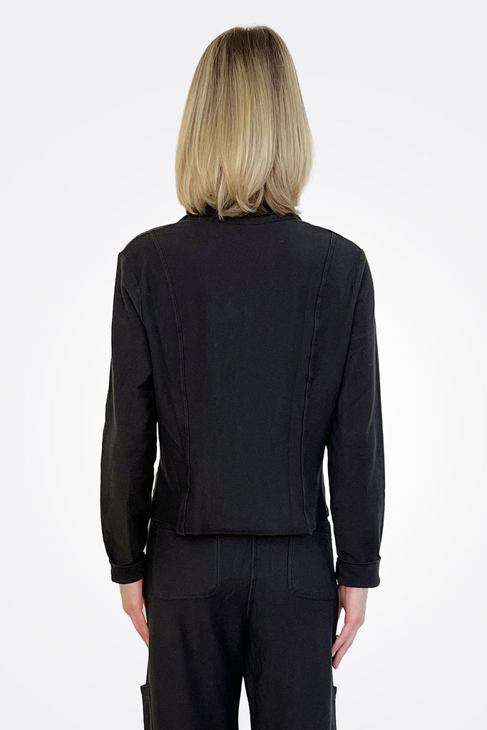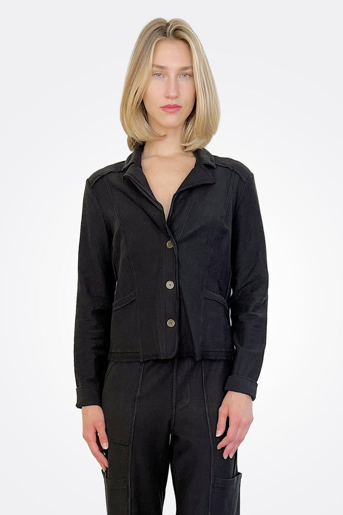 This slightly cropped blazer features raw edge details, three button closure, front pockets and a stretchy comfort knit.