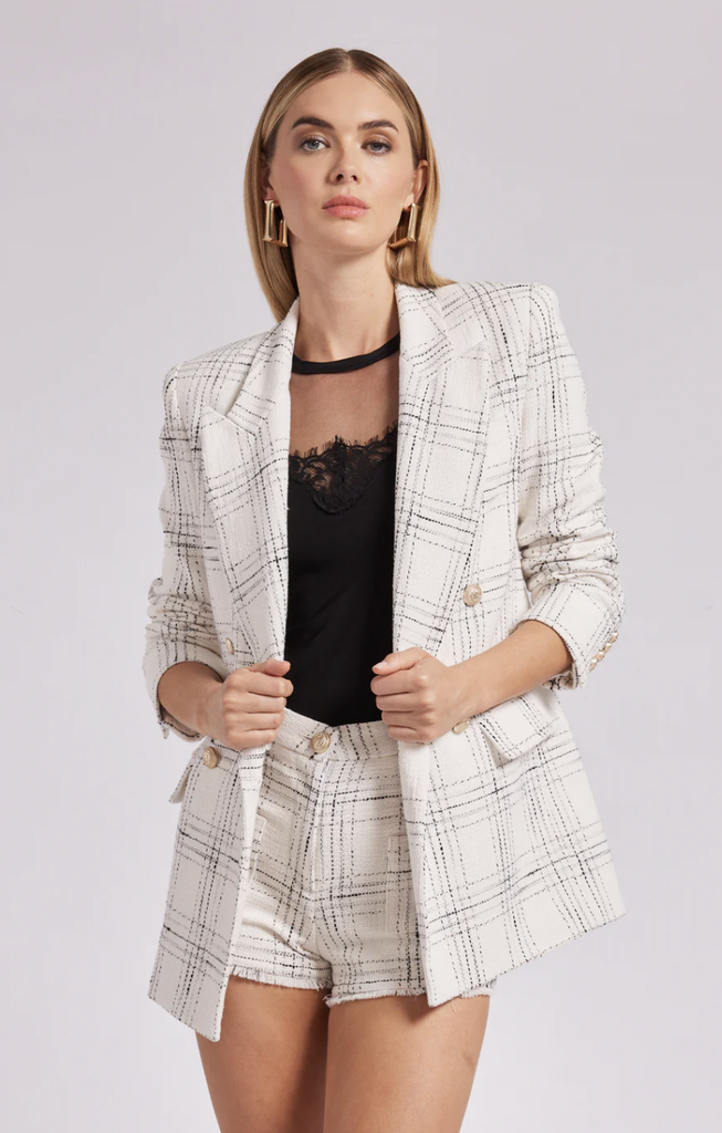 Go classically preppy in the Talan. Made with our crafted tweed, a double breasted design and gold buttons, this timeless blazer will pair perfectly with all your favorite trousers and jeans for work or the weekend. Generation Love’s tweed is crafted with recycled fabric.