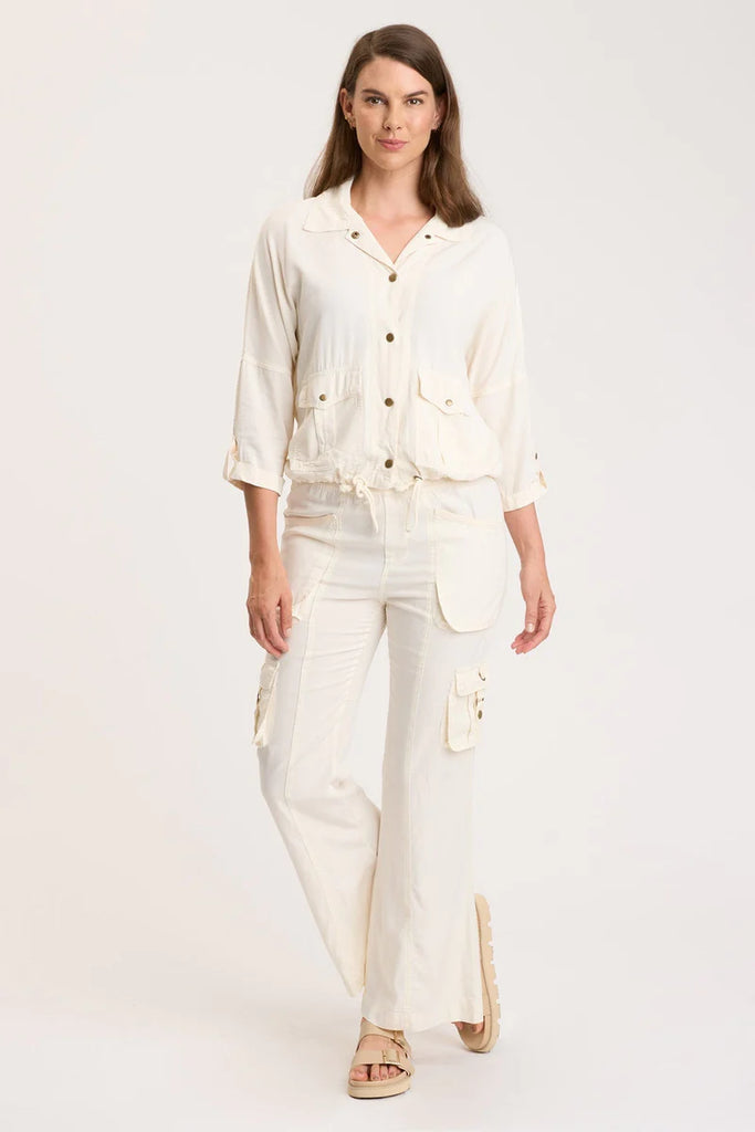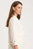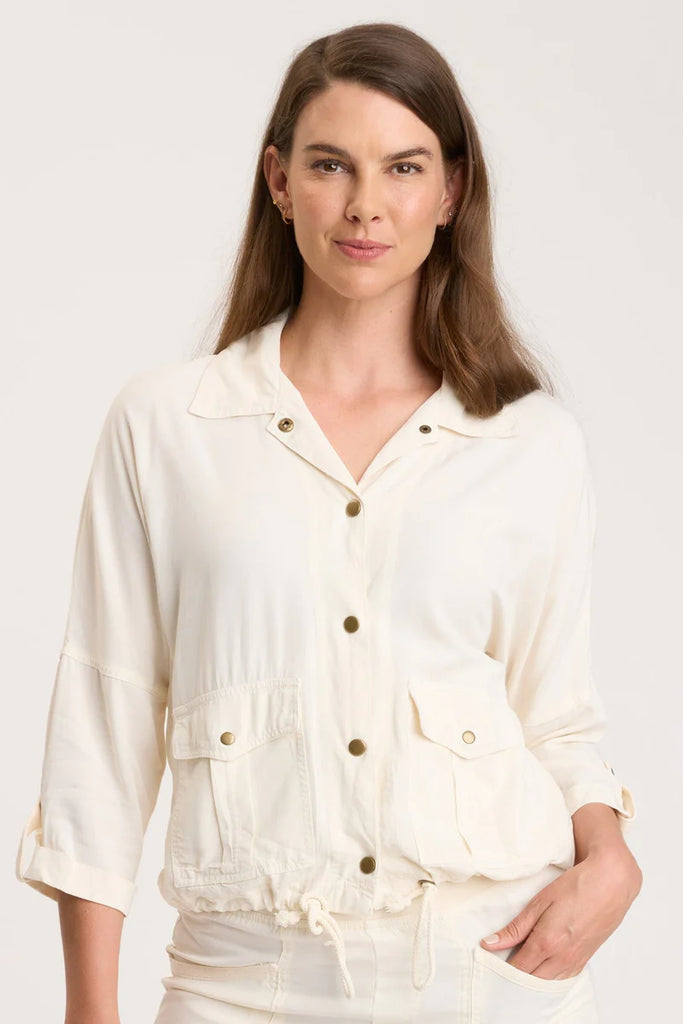 Flat brass snaps are dotted throughout our newest light jacket. With jersey contrast on the back shoulders, two front pleated pockets and tabbed 3/4 sleeves, wearing Vesuvio will capture all the feel-good moments while you look oh-so-good in it!