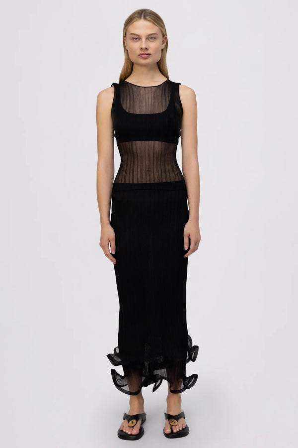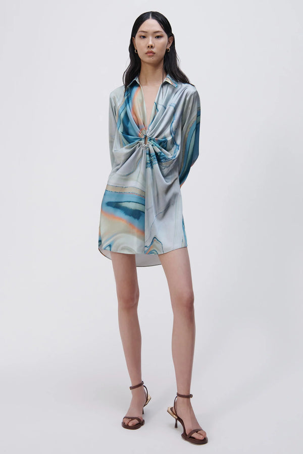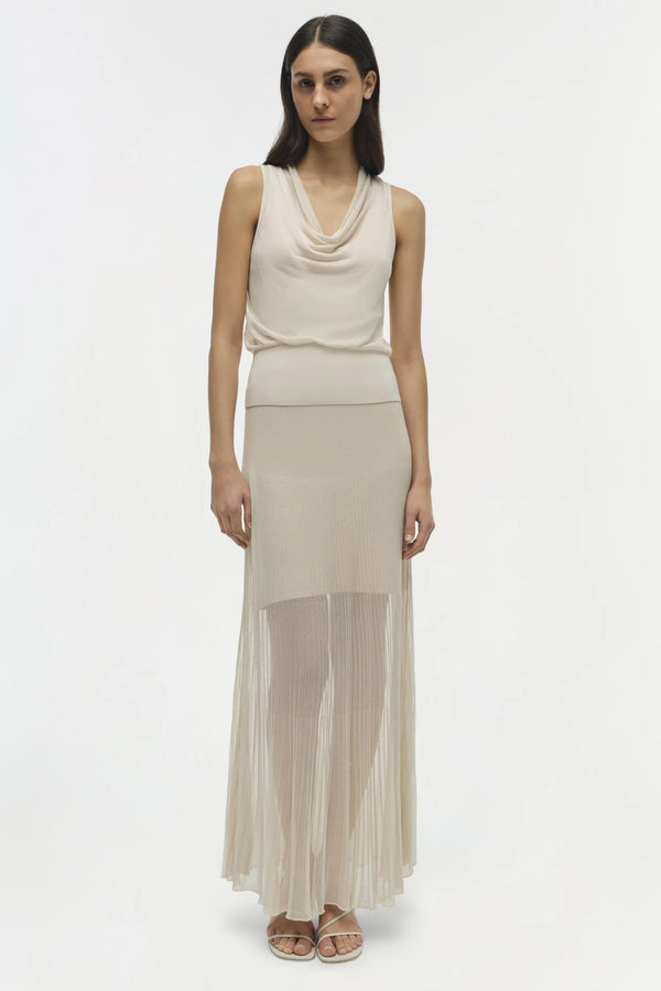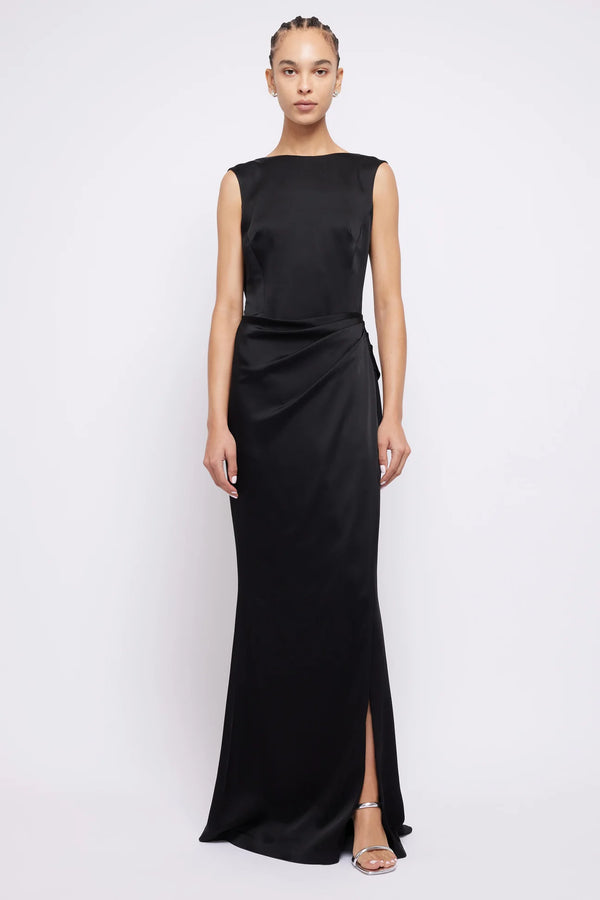 Every piece highlights the brand’s signature tension between strength and sensuality. Think draped Angeline Draped Midi Dress in Dried Pineapple, engineered with structured dimension and sleek cocktail crepe detailing, or the Cillian Straight Leg Pant, tailoring that balances relaxed ease with sculptural precision. Soft Theodora Bustier Tops, versatile swimwear, and drawn silhouettes create a cohesive wardrobe built around architectural fashion.