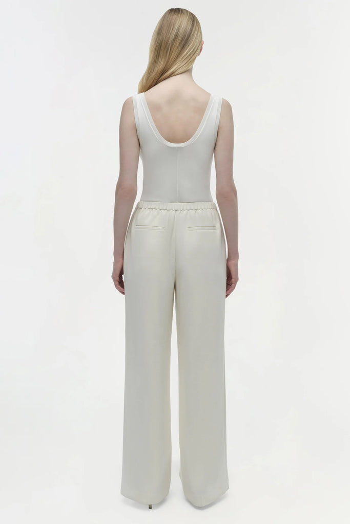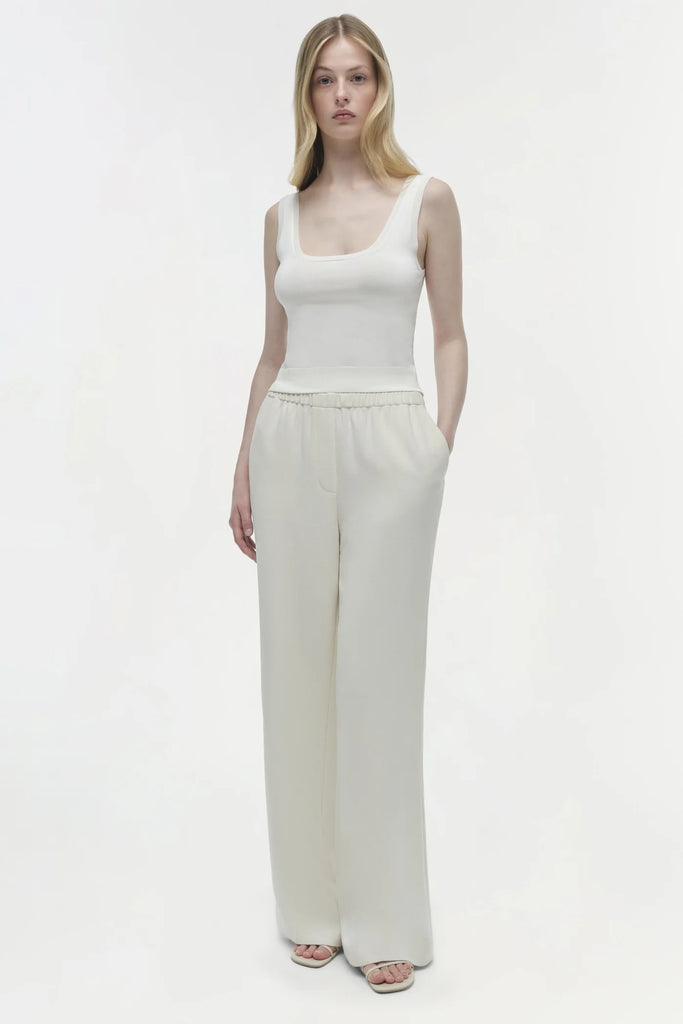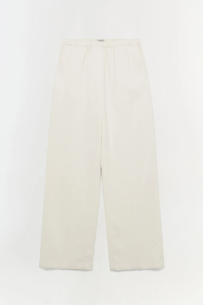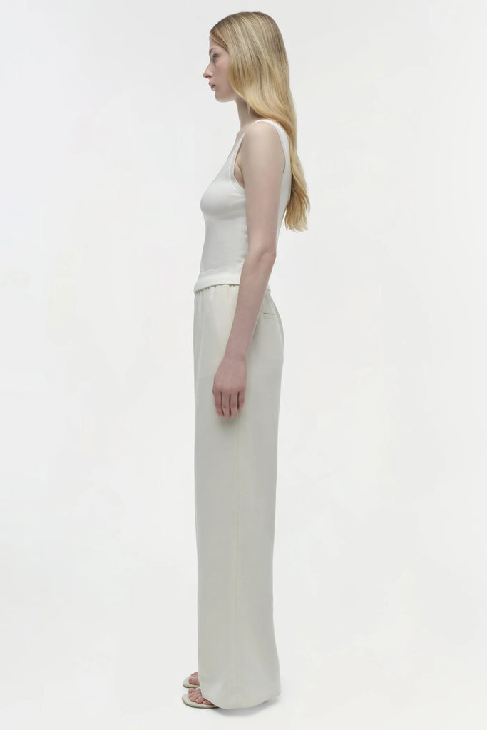 The Cillian Straight Pant in Snow. Crafted from frayed crossweave draping fabric, these straight-leg pants offer a sophisticated and fluid silhouette