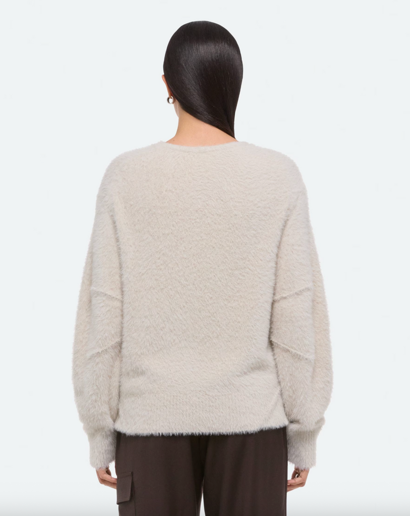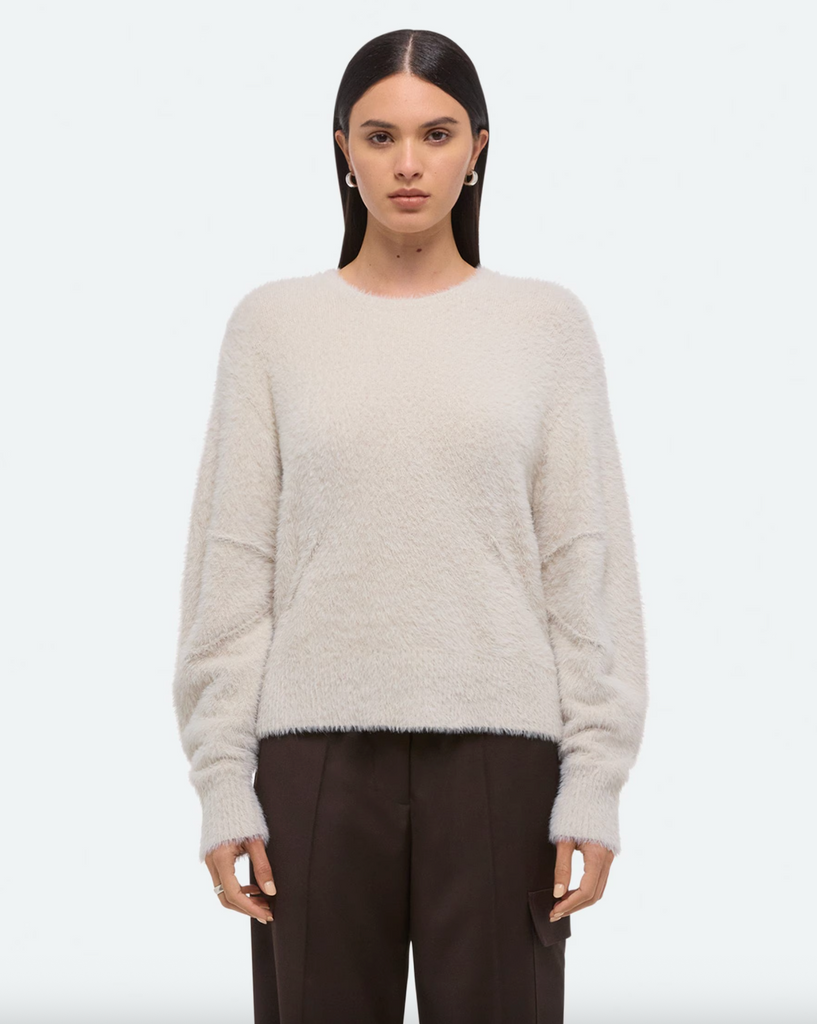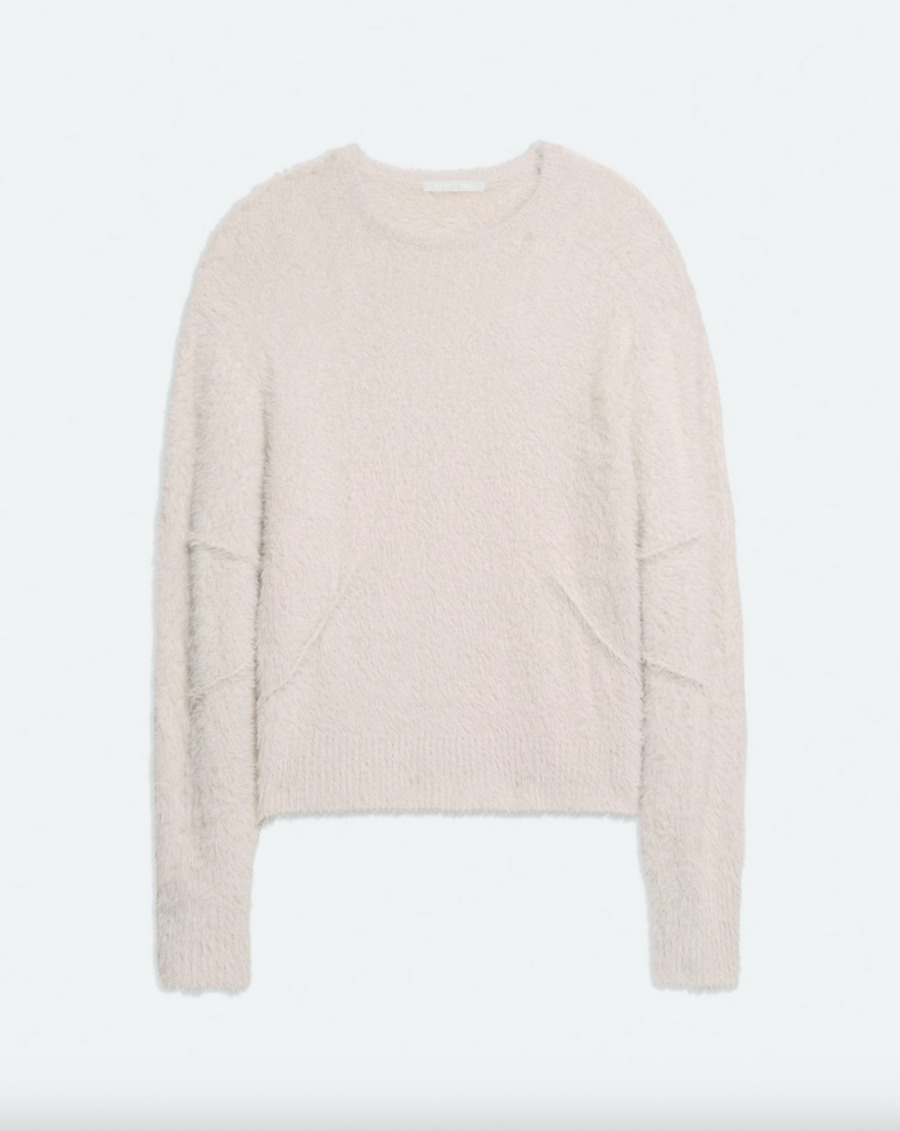 Crewneck sweater in a feathery eyelash knit. Pin-tucked seams wrap around the body, adding a softly curved shape to the slouchy fit.