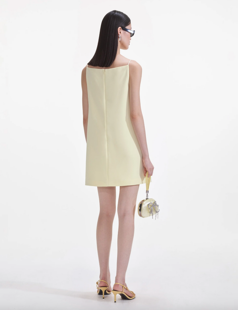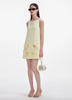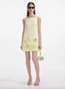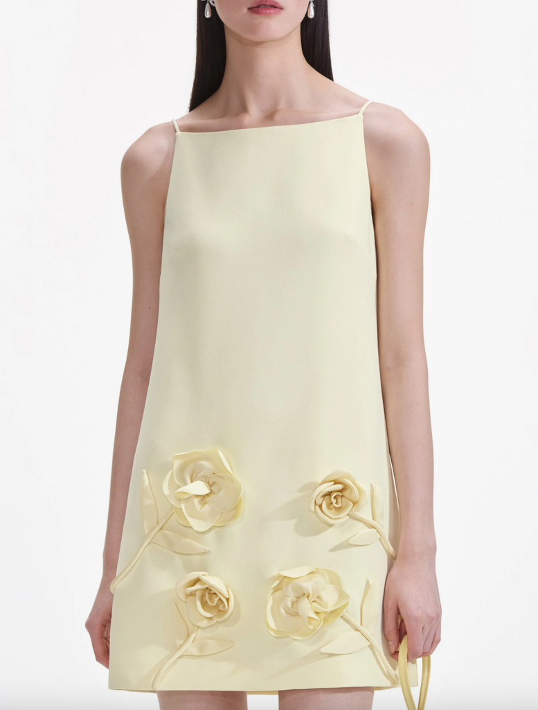 Everything's coming up roses in this yellow crepe shift dress. Sculptural flower motifs add a touch of luxurious detailing to the minimalist cut. Show off its mini length with a pair of platforms.