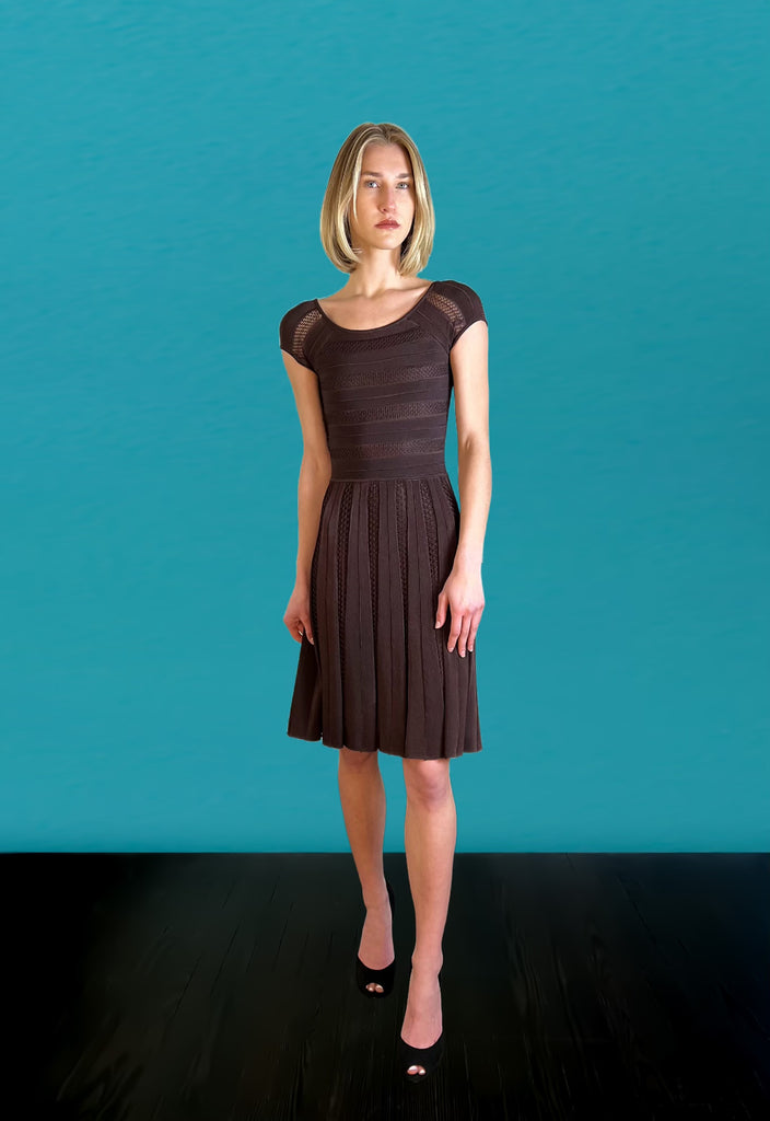 80% rayon, 20% spandex. Made in China. Fully lined. Knit fabric. Open knit detail. Pleated bottom.