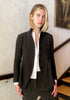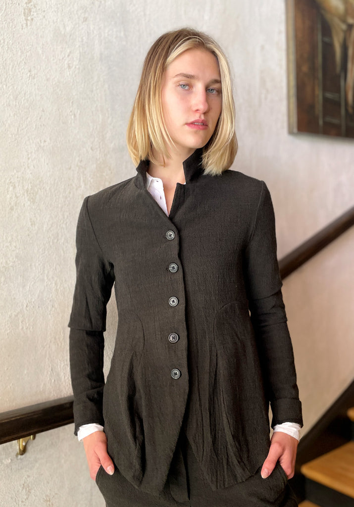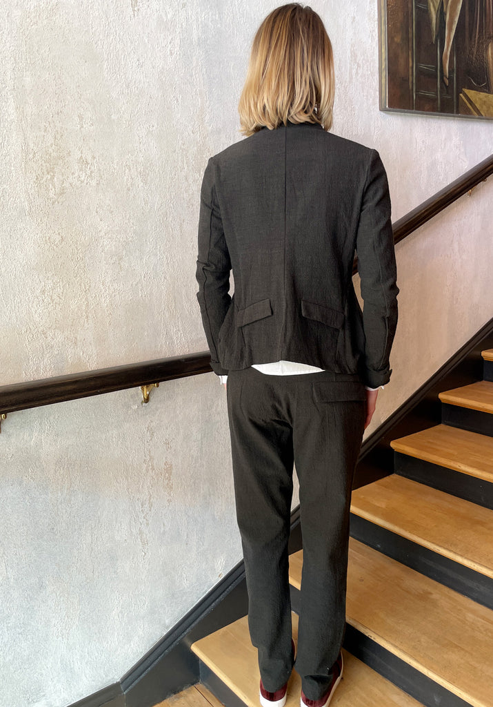The chic wool jacket with stretch content by RUNDHOLZ BLACK LABEL completes your daily outfit on cold winter days. The small lapel collar which merges into a continuous button placket, piped pockets on the front and two flap pockets on the back gives the fine item of clothing the distinctive touch. The stretchable lining contributes to the great wear comfort.