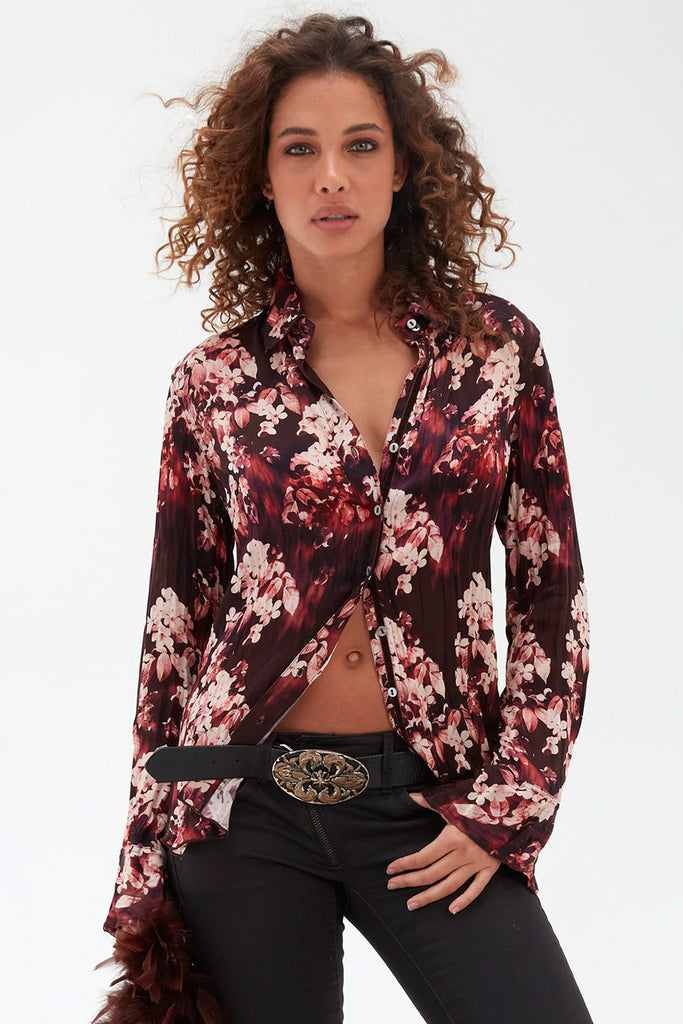CINO shirt - 100% rayon print button down shirt. Crinkle satin fabric with roll-up sleeves and ribbon detail.