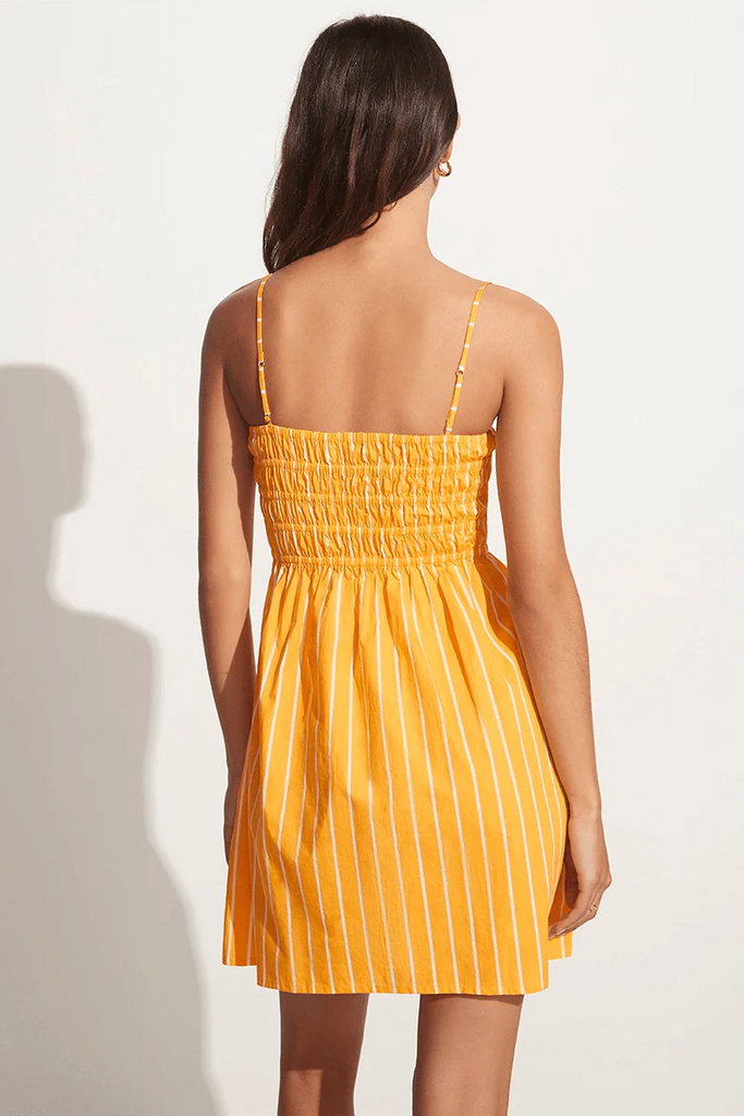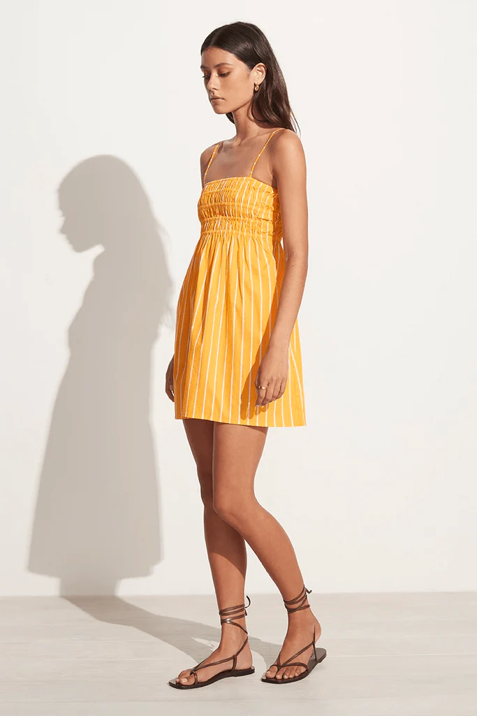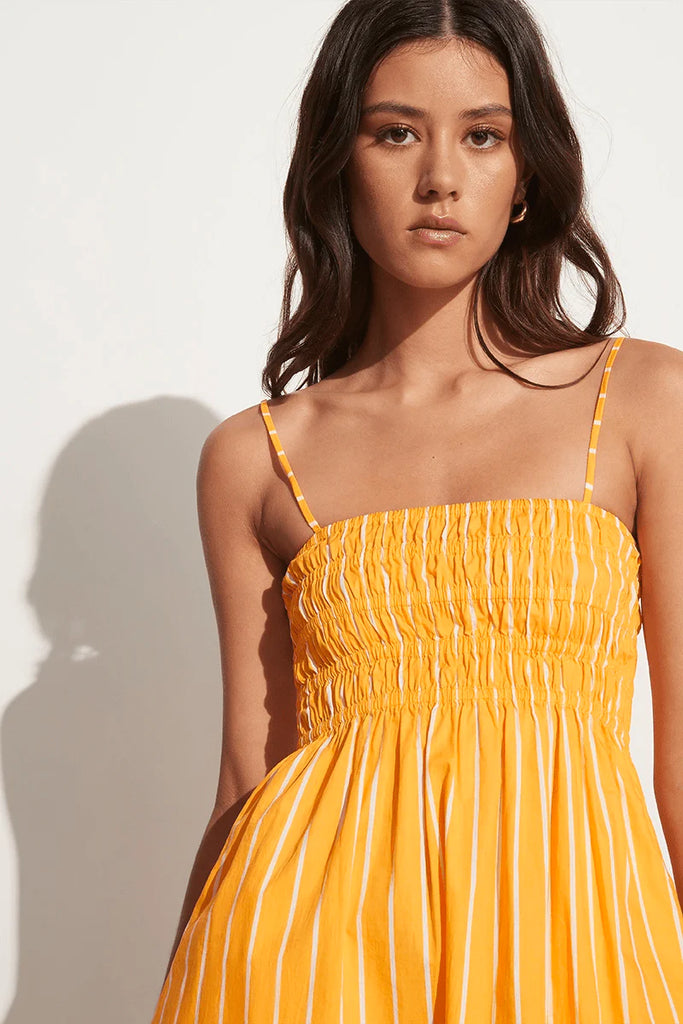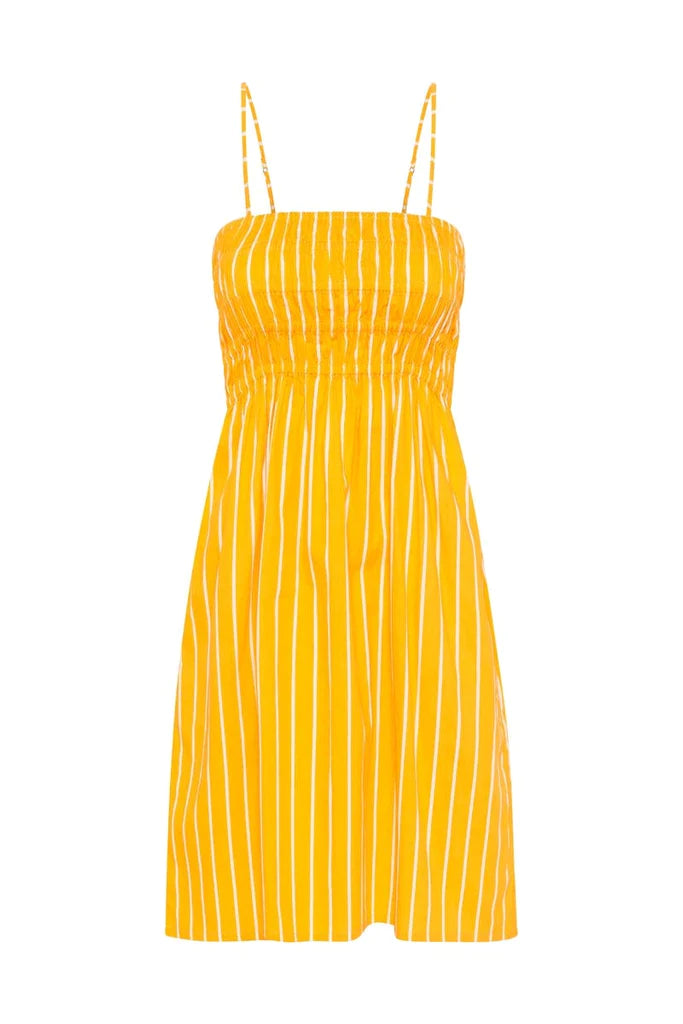 Crisp organic cotton poplin meets a feminine silhouette to form a summer wardrobe essential in the Josefine Mini Dress. A striped mini length dress with an easy-to-wear elasticated bodice, square neckline and relaxed skirt. Patterned with citrus yellow stripes throughout using artisanal hand-printing techniques, the Josefine will effortlessly transport you to all your summer and vacation occasions.
