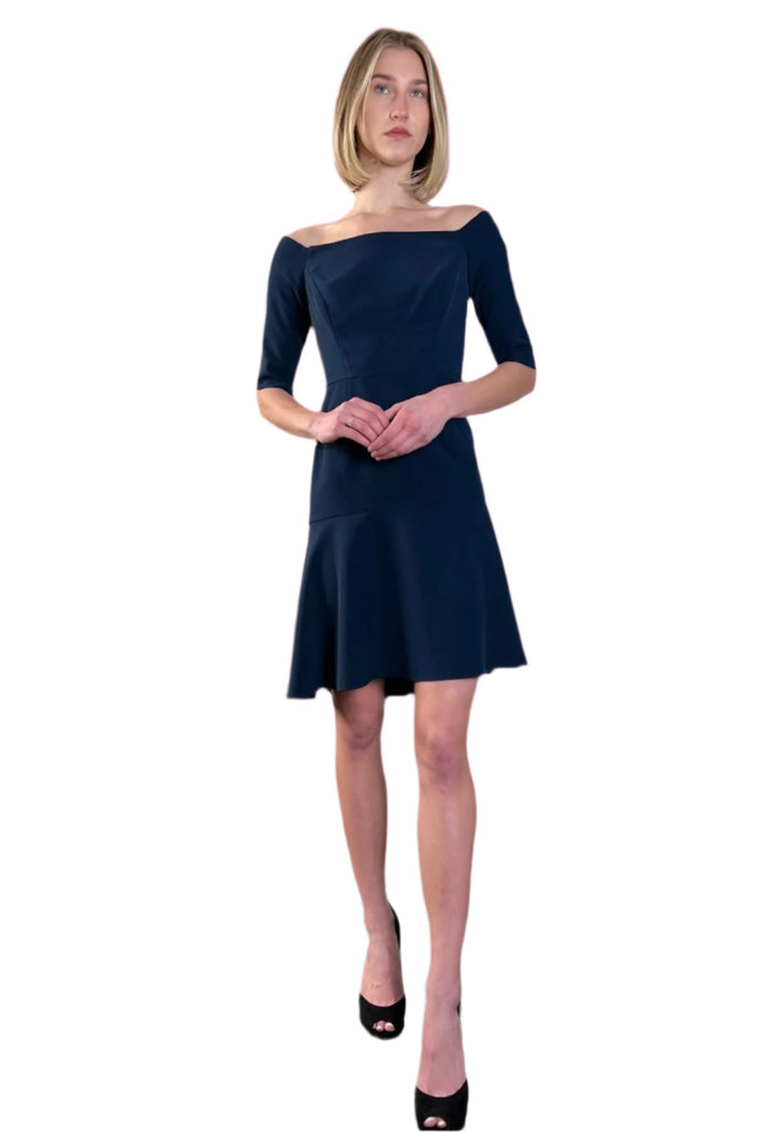 Italian cady nina dress. Fashioned in Italian cady. Off the shoulder dress with elbow length sleeve. Seamed drop waist with slight flounce hem.