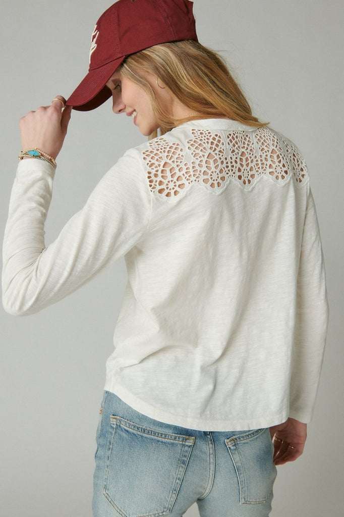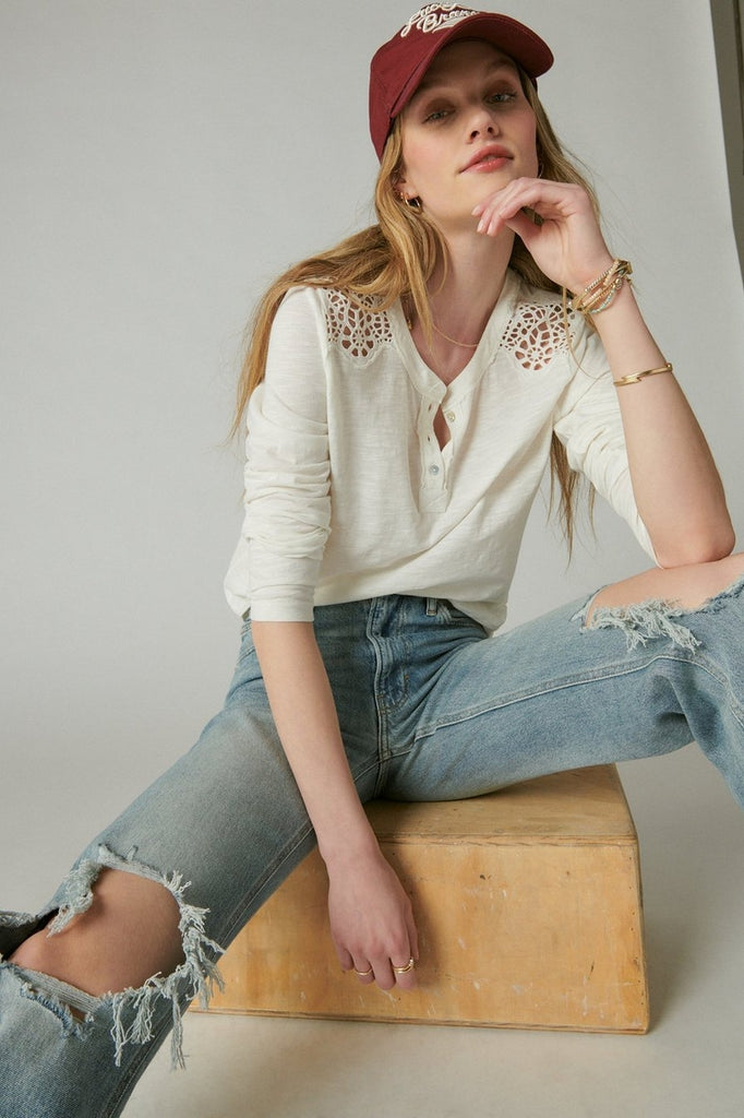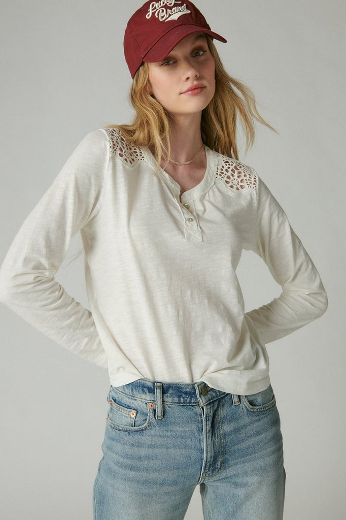 Level up your henley game with this long sleeve style showcasing a fun cutwork design at the shoulders and back.