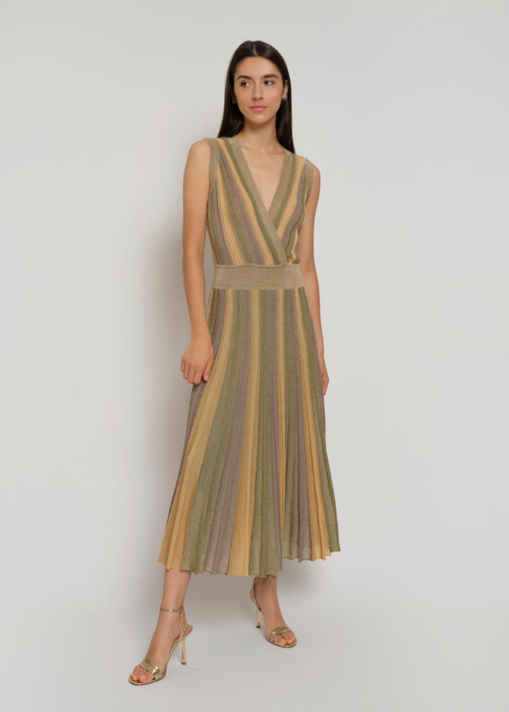 Long pleated tricolor dress in Lurex® knit, it has a wrap neckline and is elasticated at the waist.