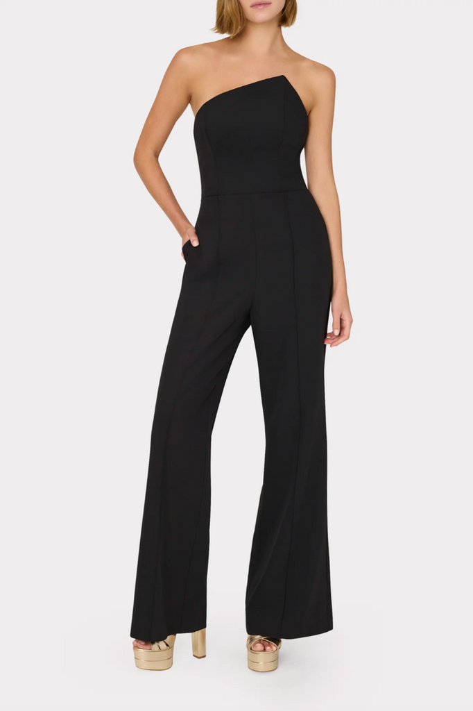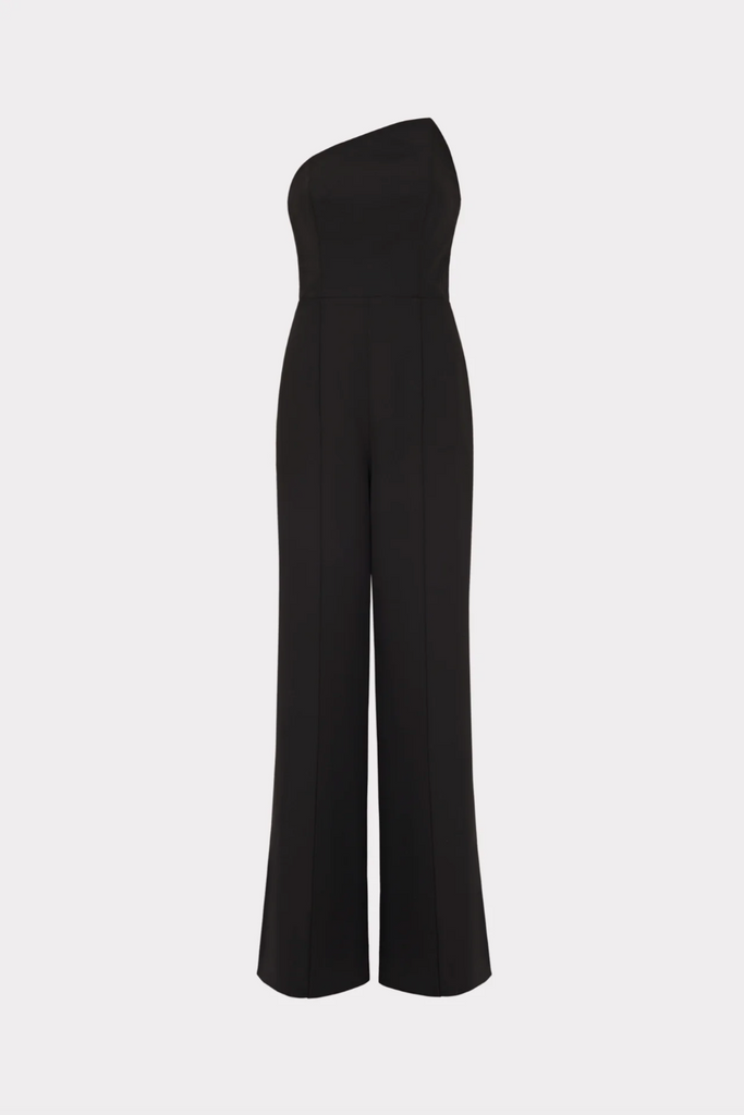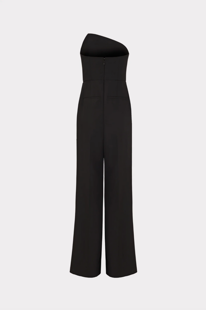 Your sleek and stylish alternative to a cocktail dress. With a strapless, asymmetric neckline and crisp wide leg cut, this tailored jumpsuit is a piece you’ll turn to time and time again. Made from our classic Cady fabric with pockets, darts on the bodice for structure, and seams on the leg for an elongated, elevated look.