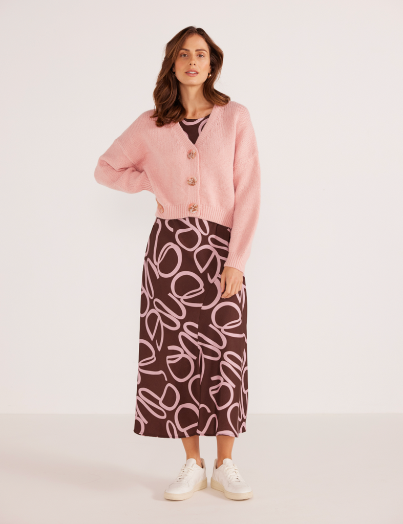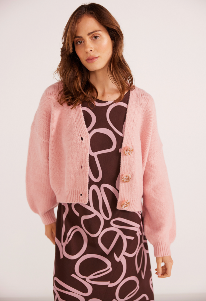Expertly crafted, this Rose Relaxed Knit Cardigan by Minkpink features a drop shoulder silhouette with shell buttons, making it a stylish and effortless addition to your wardrobe. The soft knit material and slightly cropped length provide both comfort and a flattering look, while the pretty rose color adds a touch of femininity.