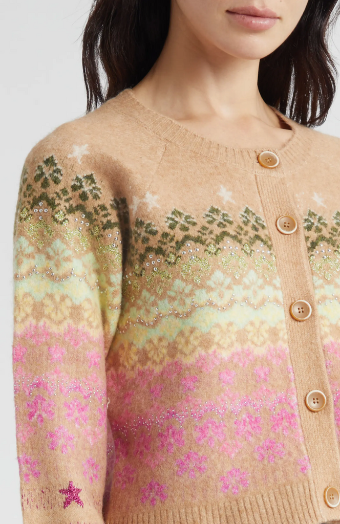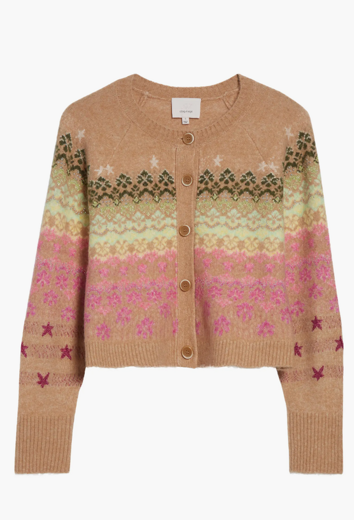 - Crafted in soft cotton, the "Millie" cardigan by Cinq á Sept features a multi-color fairisle motif with shimmering embellishment.