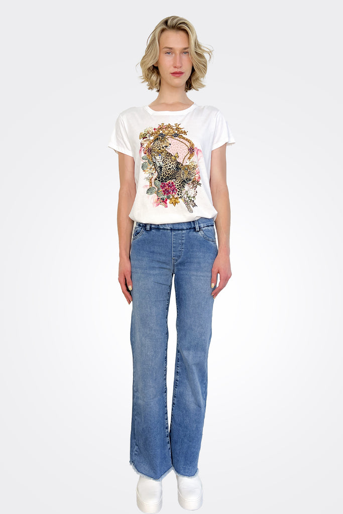 Amanda Light Denim with belt loop and flare, soft fabric. 98% cotton 2% lycra. Machine washable. Does not wrinkle or fade. Comfortable, stylish, very flattering. Wear with sneakers, sandals, booties, heels. Wear it casual or dressy for evening. Try them and you will see why these pants have been the #1 selling item in boutiques all around the U.S. Inseam: 28", Rise: 10"