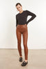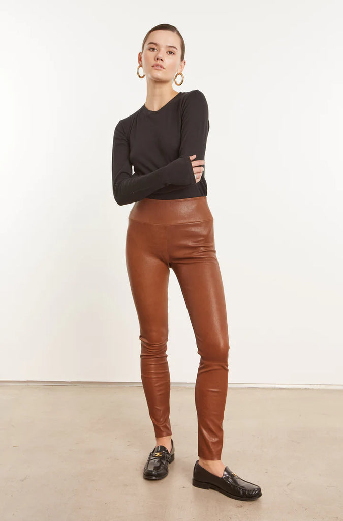 The dark cognac leather ankle leggings are versatile and effortlessly chic but what really sets them apart is their exceptional cut and quality. Fitted with a high-rise elastic waistband, they are buttery soft and adapt easily to any body type. These can be casual or dressed up and paired well with boots or slides, a boyfriend sweater or a white tee.