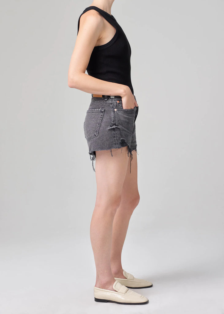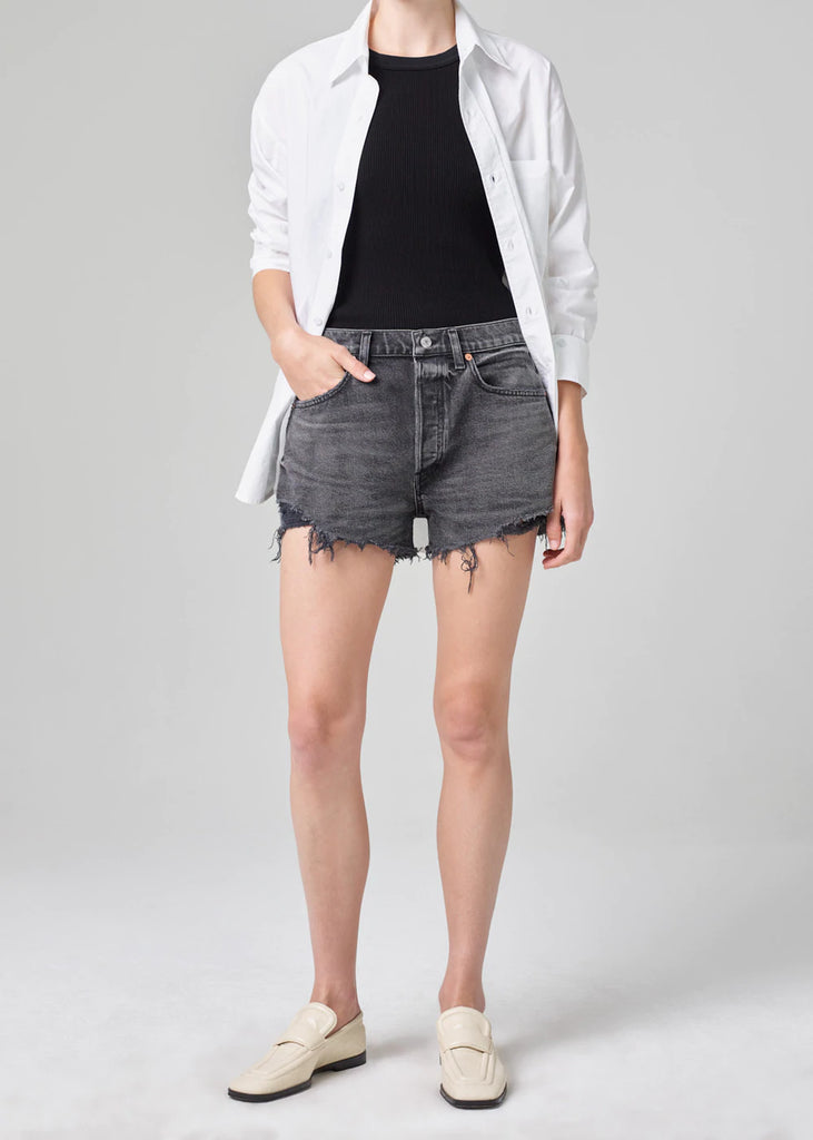 The perfect pair when you’re bound for warmer weather. These vintage-inspired shorts have an easy, boyish fit with distressed hems.