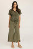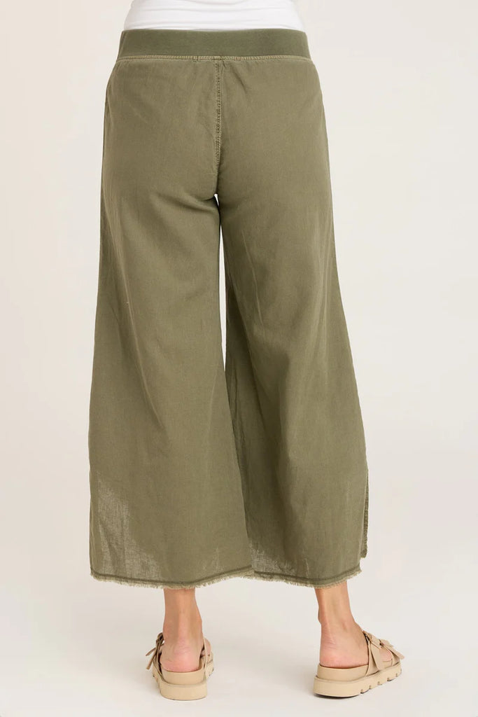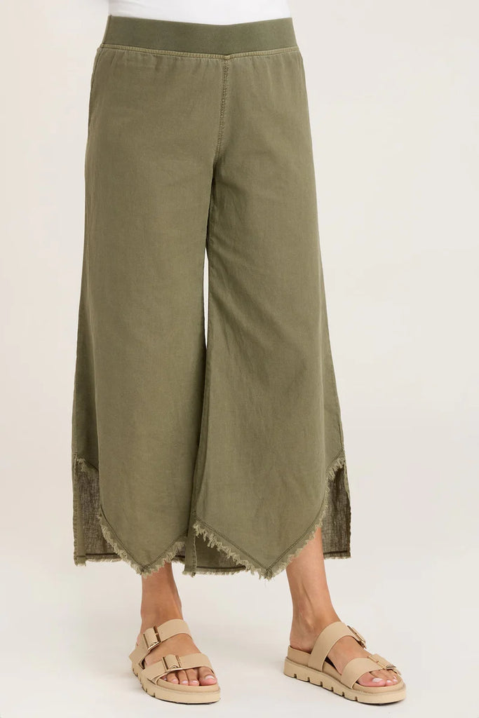Our favorite wide leg pant in a slightly modified fabric for a less wrinkled look. This one features a linen/cotton blend body with an elastic pull-on waistband, wide leg, and an asymmetric handkerchief hemline with raw edges.