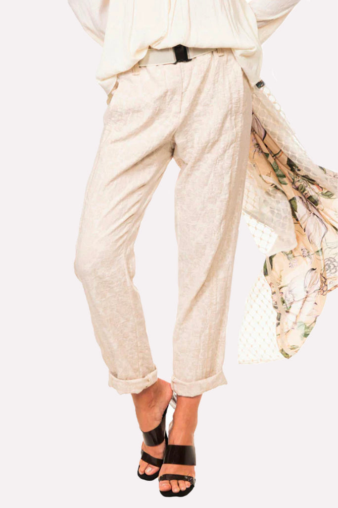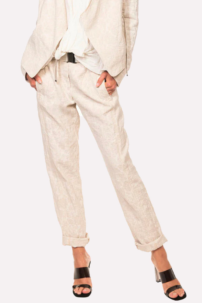 The Beate Heymann Roll Up Jacquard Trouser is a flattering, lightweight pant with an elegant, subtle print. This pant features an floral jacquard print, a rolled up cuff, an elastic belt, two front pockets, a straight leg, a zip fly, and two back pockets.