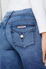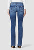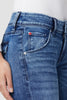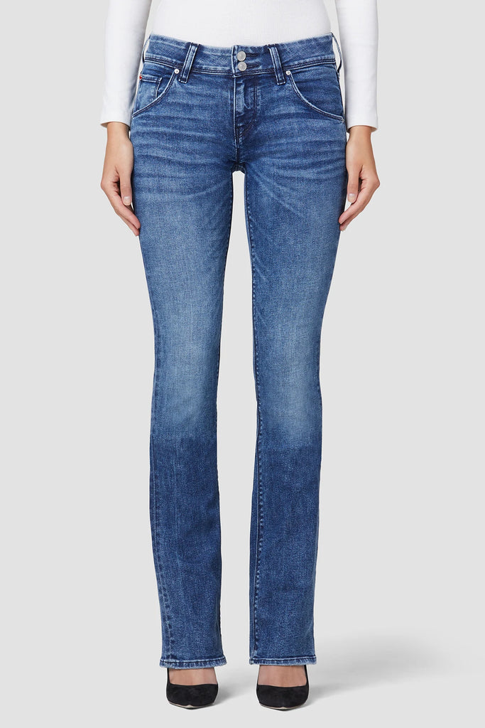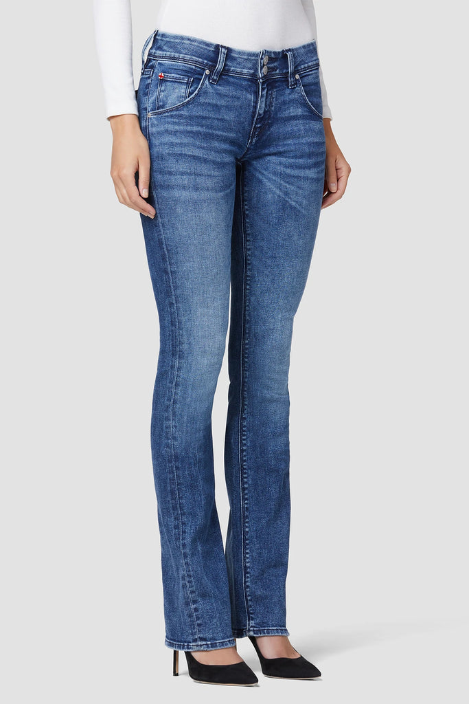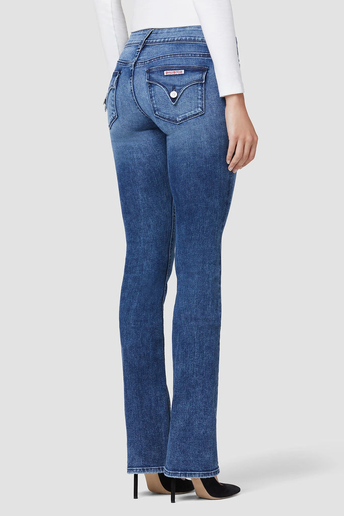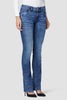 Cut with premium super stretch denim, Beth Mid-Rise Baby Bootcut Jean in medium indigo Memory Lane features expert fading, a subtly flared silhouette, and our signature button-flap back pockets.