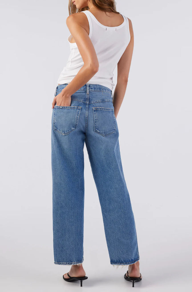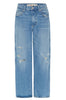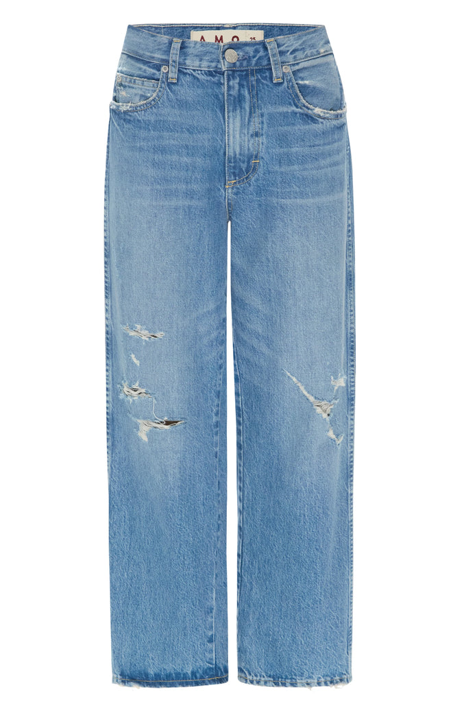 This cropped, wide straight leg is our easiest fit yet. With a mid rise, this pair is meant to sit low on the hips for a relaxed look. Thoughtful distressing throughout. Zip fly.
