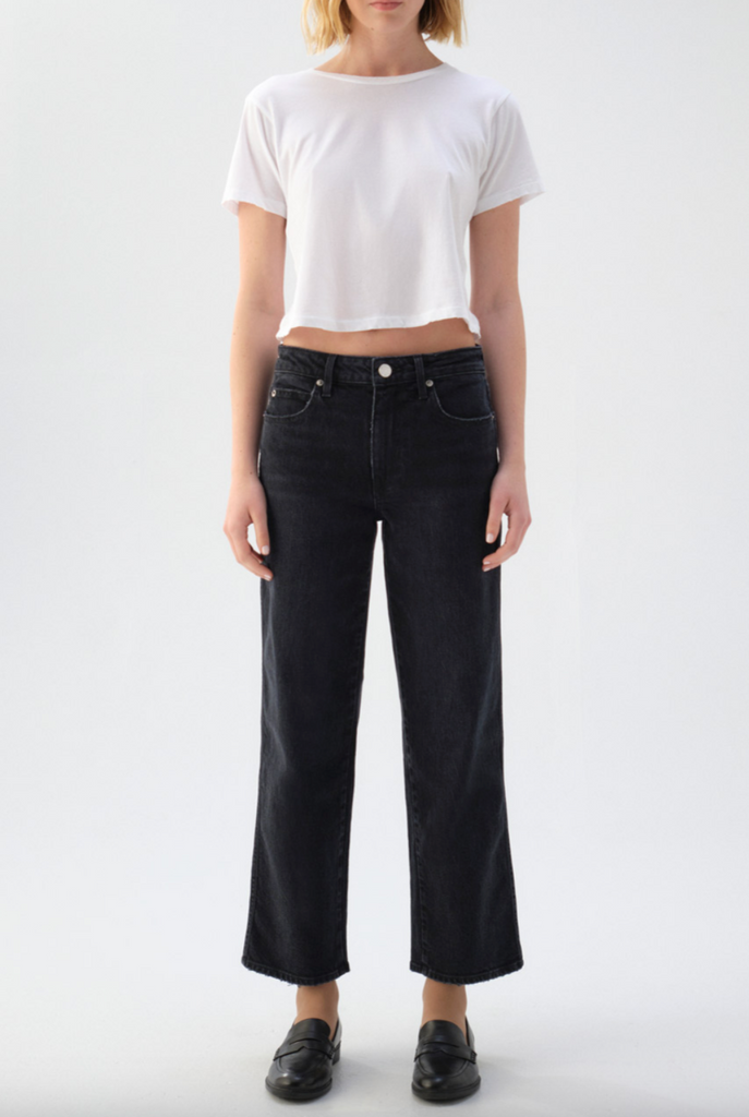 This cropped, wide straight leg is our easiest fit yet. With a mid rise, this pair is meant to sit low on the hips for a relaxed look. Thoughtful distressing throughout. Zip fly.