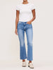Mansfield is a mid-to-light indigo wash with subtle fading and whiskering for a worn-in look. It features silver hardware, multi-colored stitching, a raw hem and an ecru back patch.