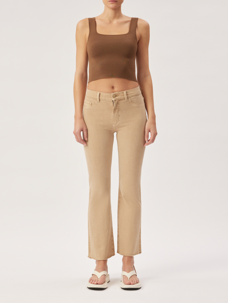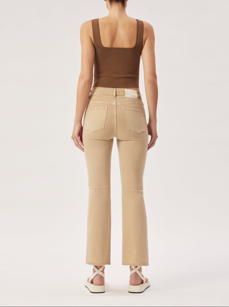 Sand is a pigment dyed classic khaki hue. It features faux front pockets, tonal stitching, brushed gold hardware, raw hem and an ecru back patch.