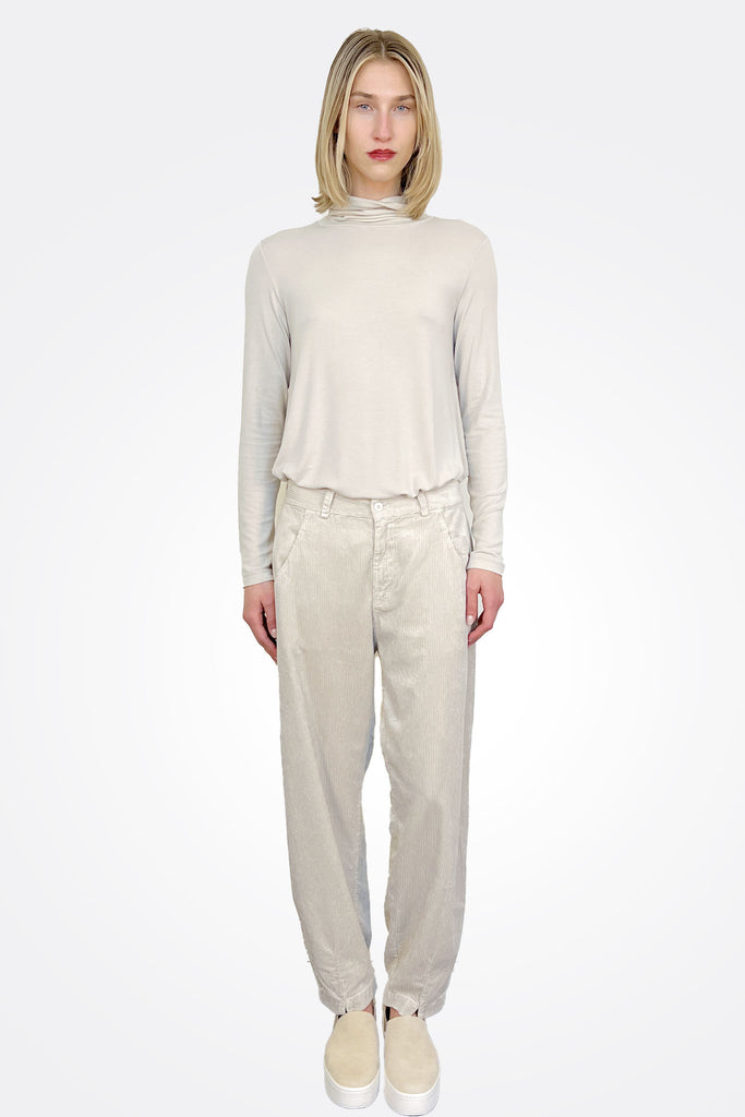 Trousers with a slightly bombée line. Rounded front pockets, kissed slit detail on the front. Garment dyed.