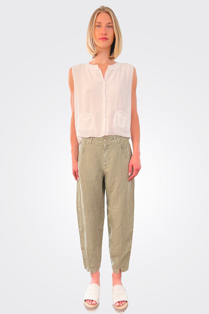 Garment-dyed linen comfort-fit trousers. Fastened with a zip and a button. Belt loops on the waist, slant pockets and small vents in the hems on the front of the legs. At the back, mock welt pocket and vertical cut pattern on the legs.