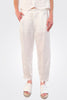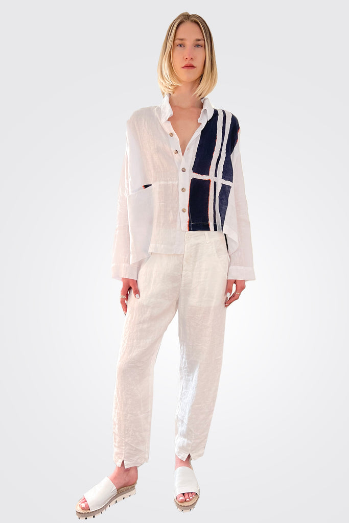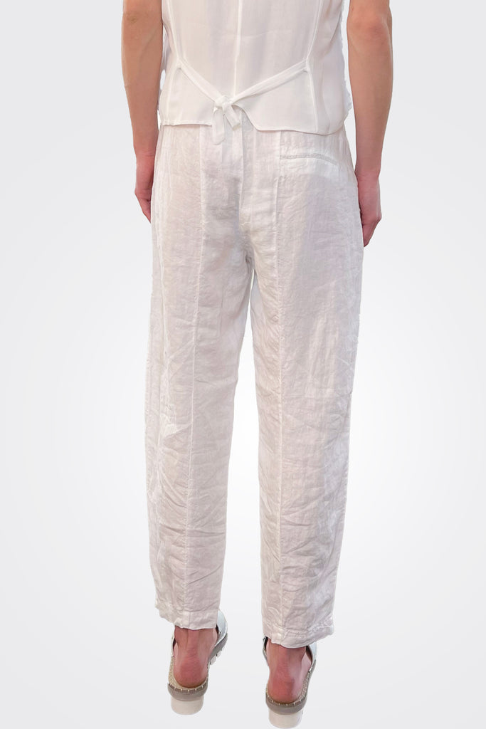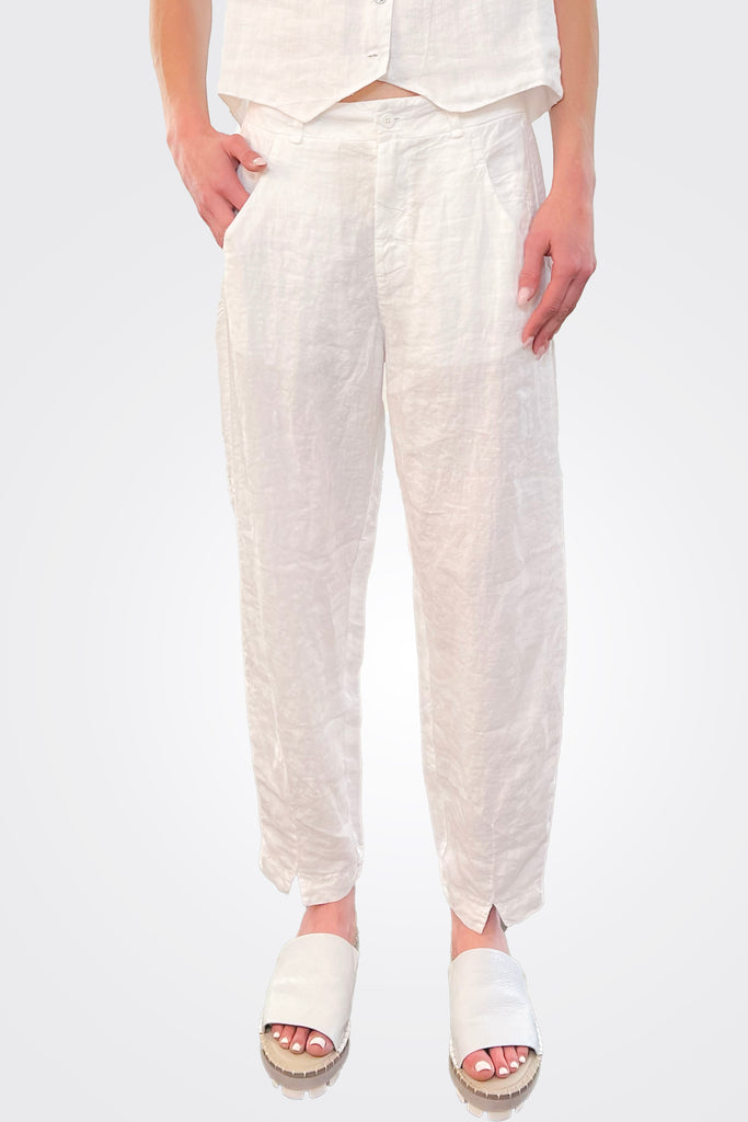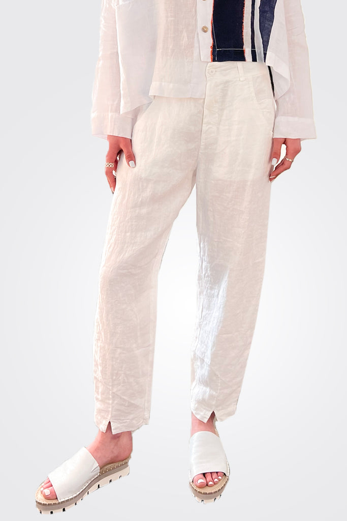 Garment-dyed linen comfort-fit trousers. Fastened with a zip and a button. Belt loops on the waist, slant pockets and small vents in the hems on the front of the legs. At the back, mock welt pocket and vertical cut pattern on the legs.