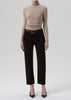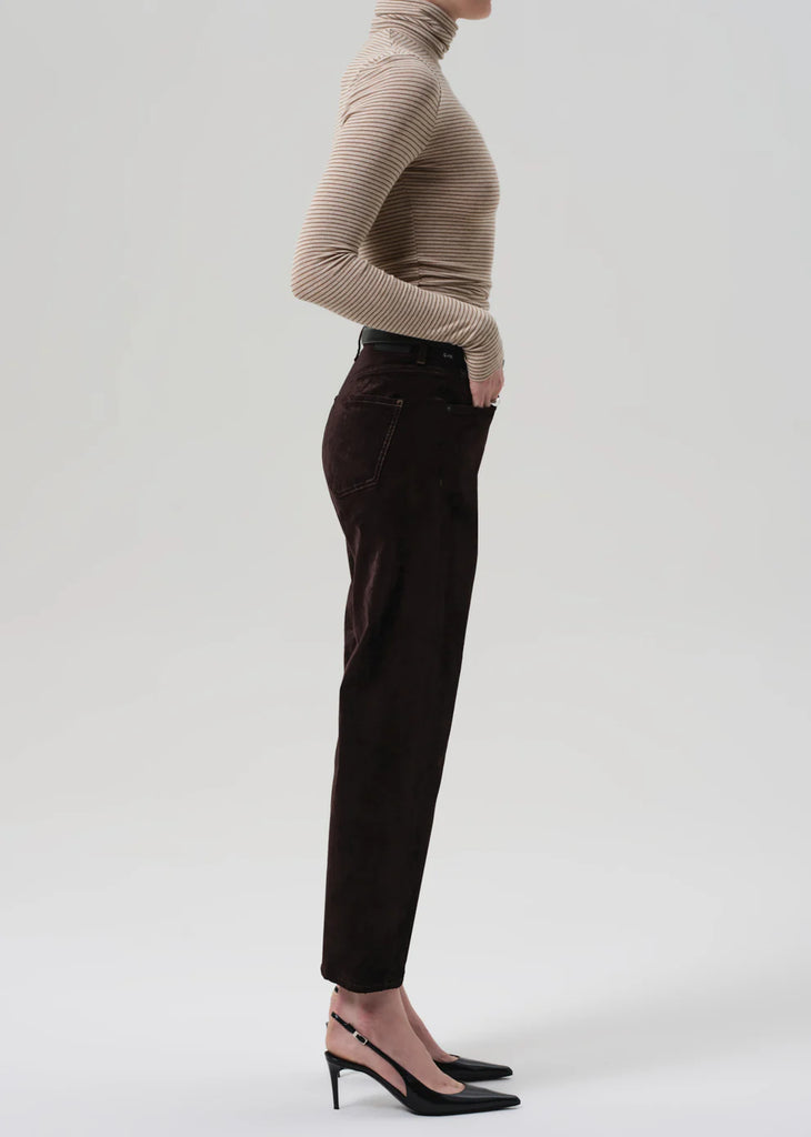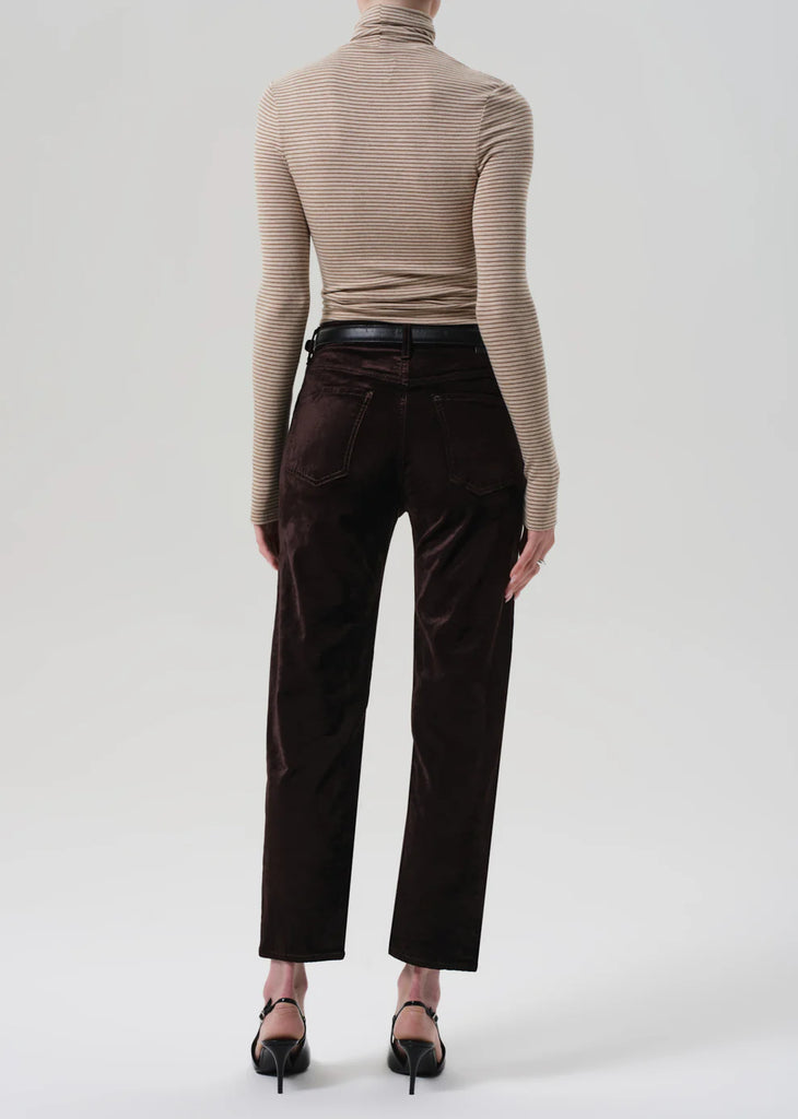 The ‘Delfina’ is a high-rise straight leg crafted from ultra-soft stretch velvet with a smooth, polished finish. Designed for a flattering, easy fit, it blends everyday comfort with elevated texture. The Espresso hue—a rich, dark brown—offers a refined alternative to black, ideal styled with tonal knits or crisp shirting.