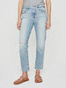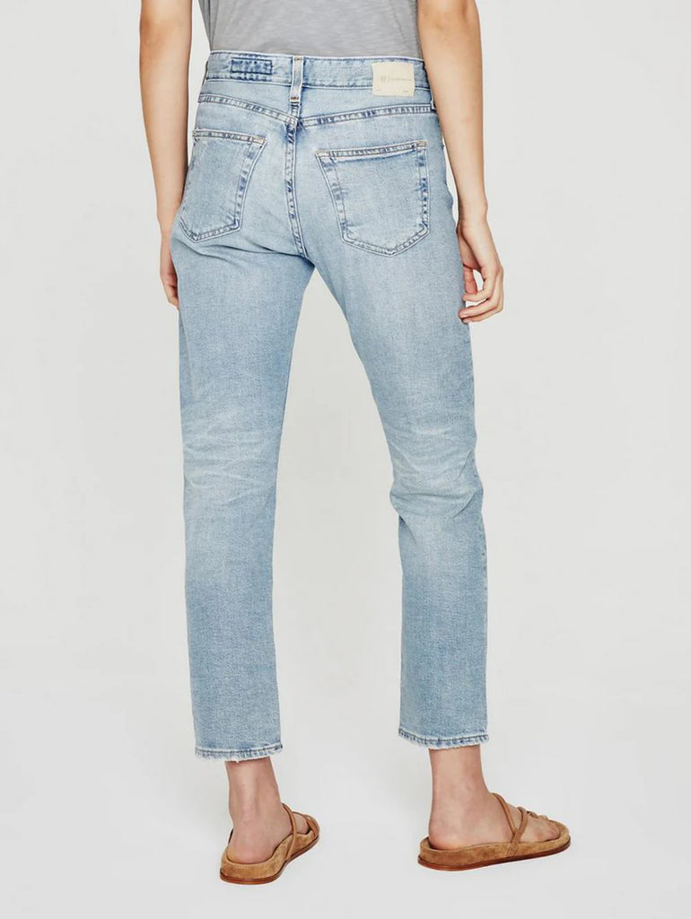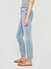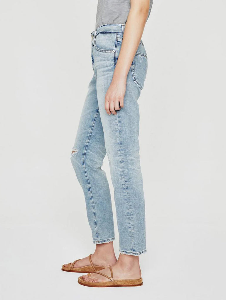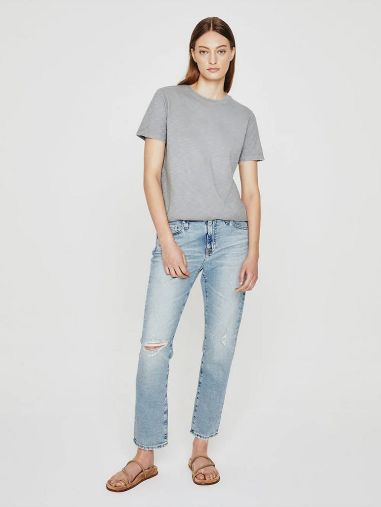 Ex-Boyfriend Slim Jean features a light indigo wash with a 20-year AG-ed™ fade, destruction at the knees, and gently worn hems. Featuring a flattering high-rise waist, the style fits slouchy and relaxed from hip to knee before slightly tapering at the leg opening for a slim finish. This slouchy boyfriend jean is designed in 10 oz. Daytripper Stretch Denim for premium comfort.