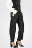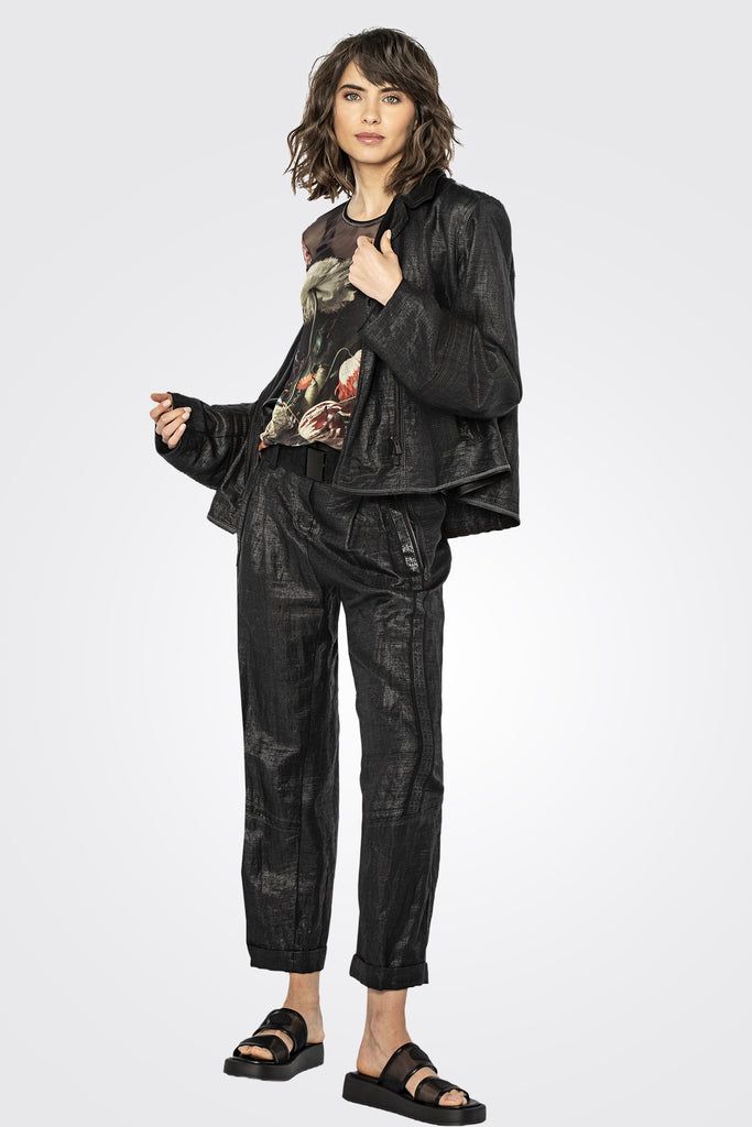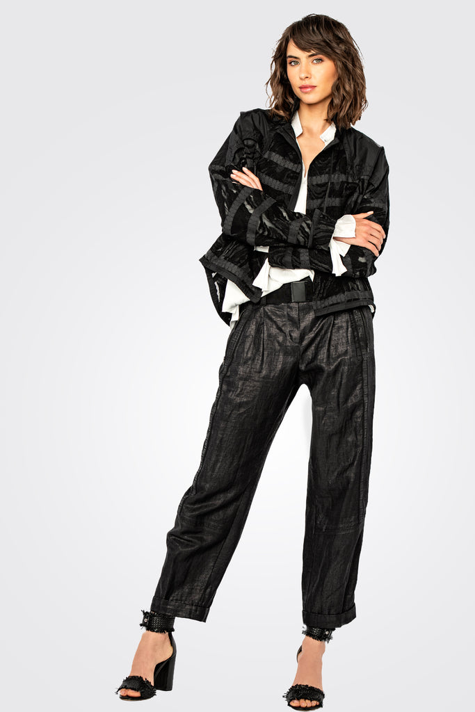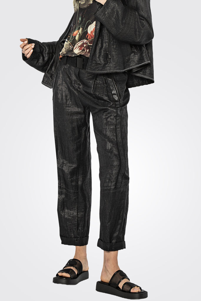 Beate Heymann linen mix trouser with a contemporary glossy finish. Features wide elastic belt with snap buckle. Double pleat at front with script tape down leg and zip pockets. Features zip pockets on front and welt pockets on rear.  Stitch details and turn up completes the look COMPOSITION: 50% Linen, 25% Viscose, 25% Polyamide