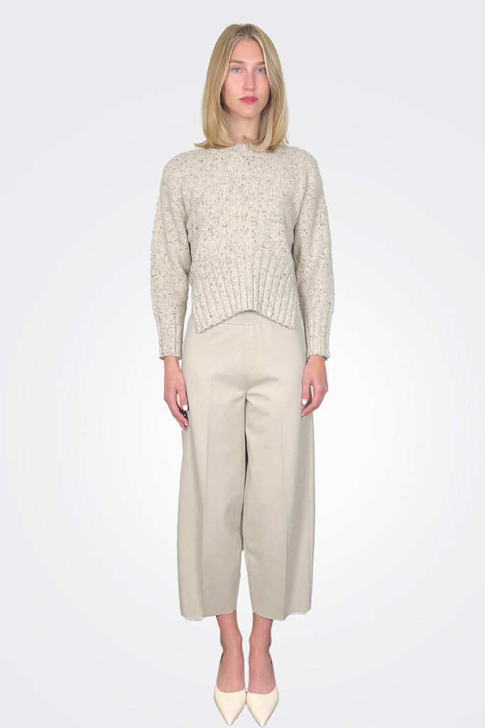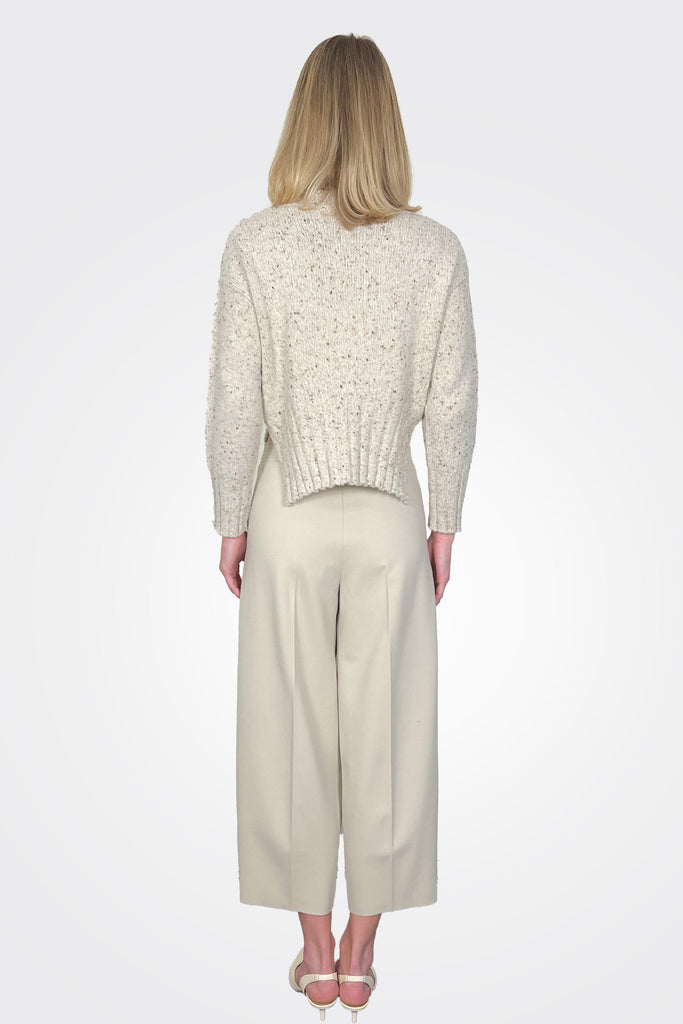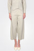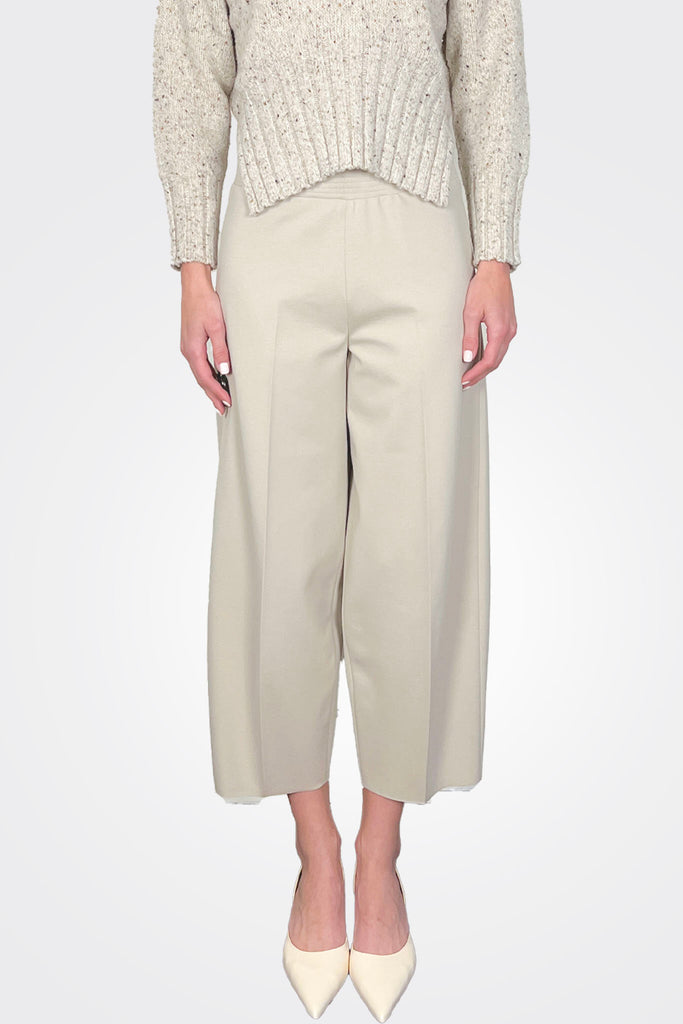 CROPPED TROUSERS IN MILAN STITCH WITH A WIDE FIT, ELASTICATED WAIST AND FAKE POCKET TRIM ON THE BACK. ANKLE LENGTH.