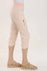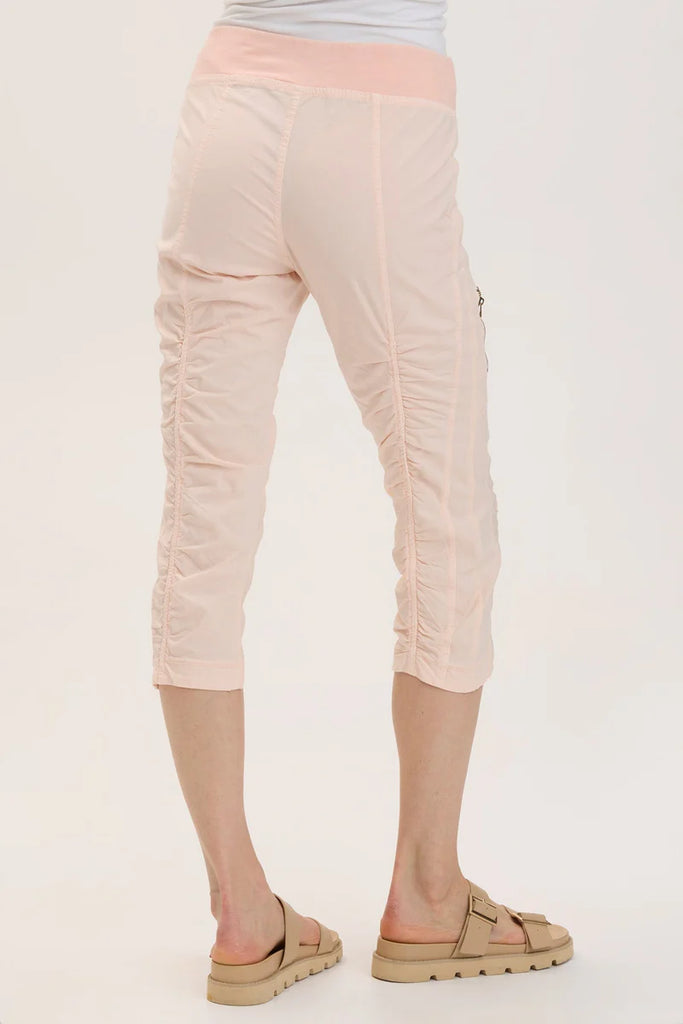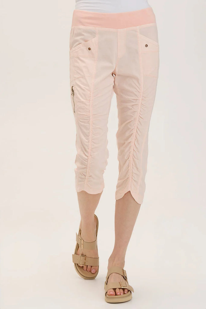 A classic! This stretch poplin crop features a fitted silhouette, two front pockets, zip side pocket, ruching along the center seam on leg front, and scalloped hemline.