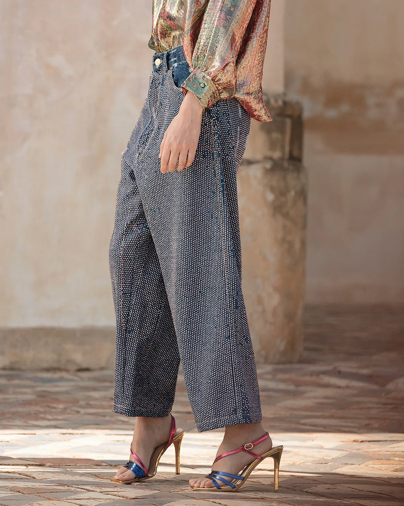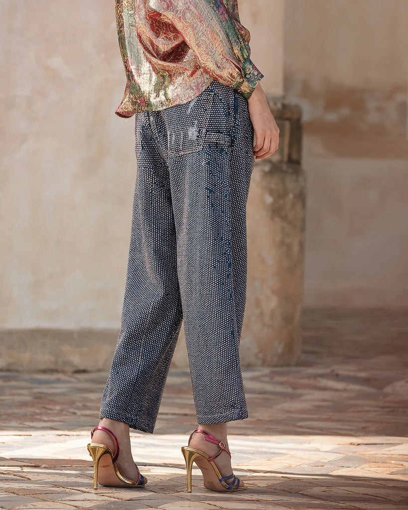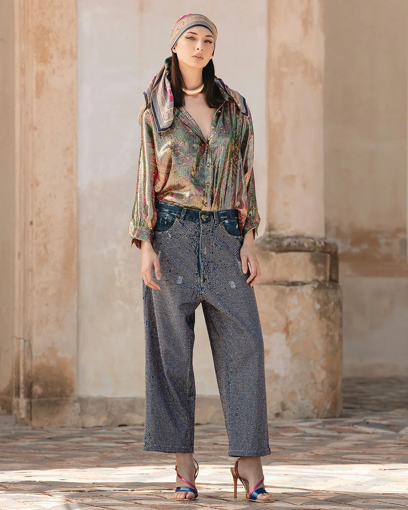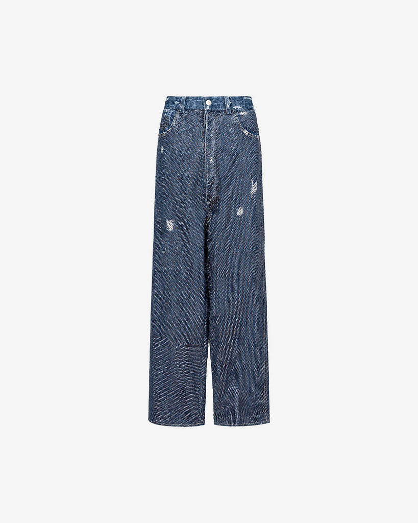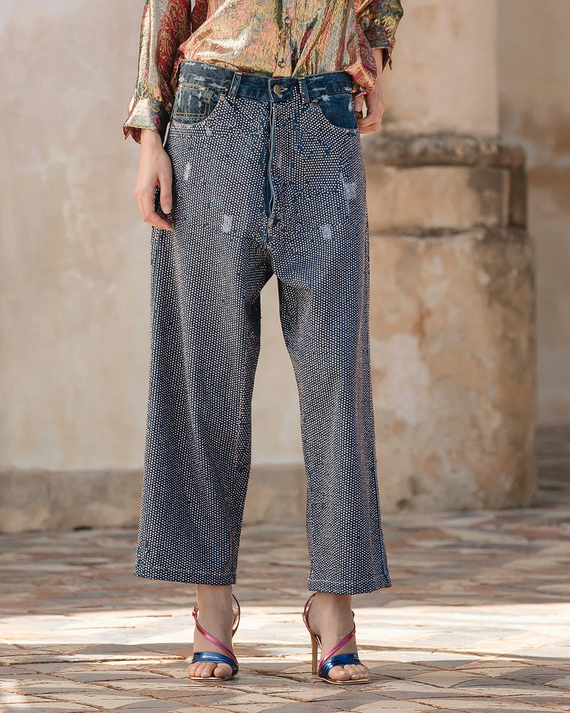 Jeans pants with ample and wide volume down to the feet covered with micro rhinestones livening up the model with style. The effect is ethereal and luminous for a piece that will remain the trend of the season.