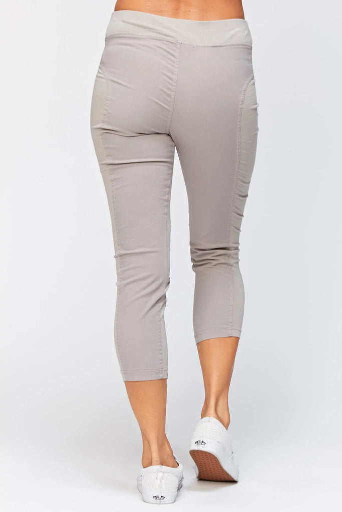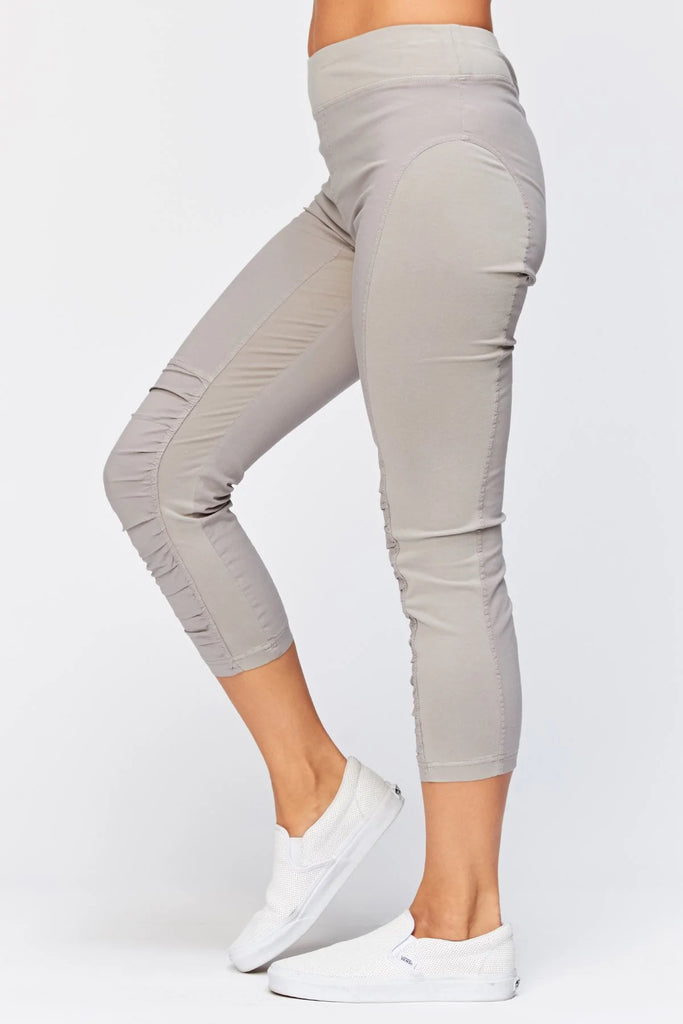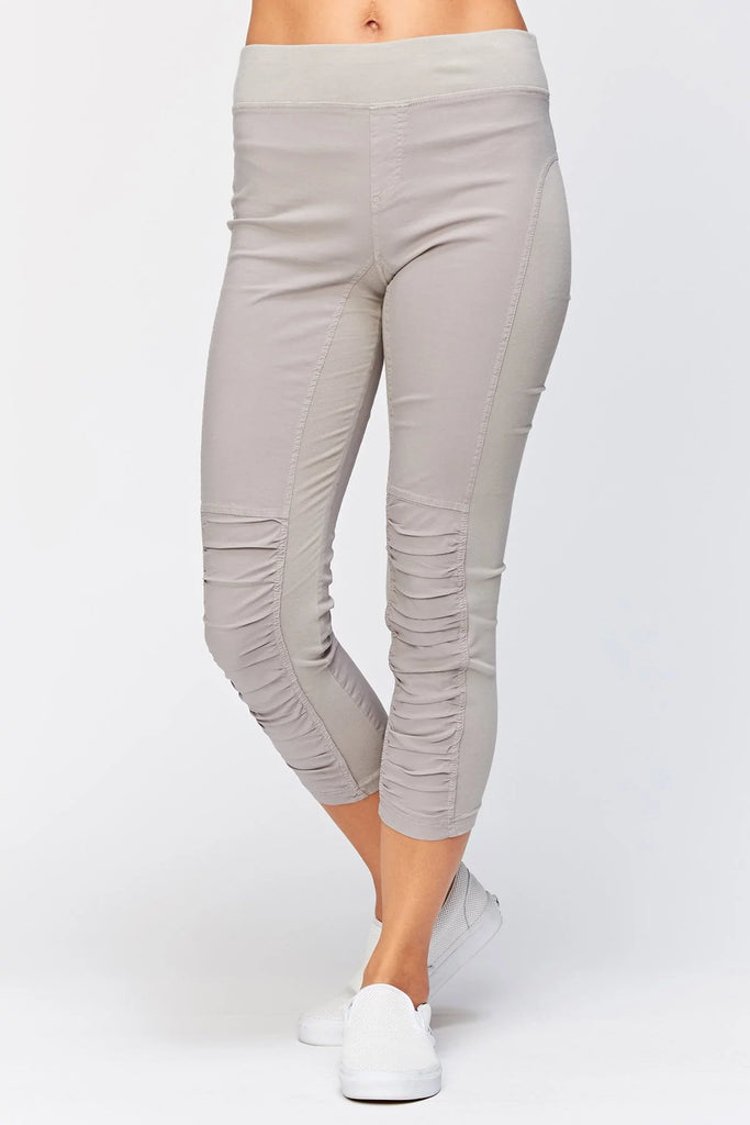This classic and an all-time favorite legging features a pull-on elastic waistband, jersey side inserts at side leg for an impeccable fit, and rouching at leg bottom.
