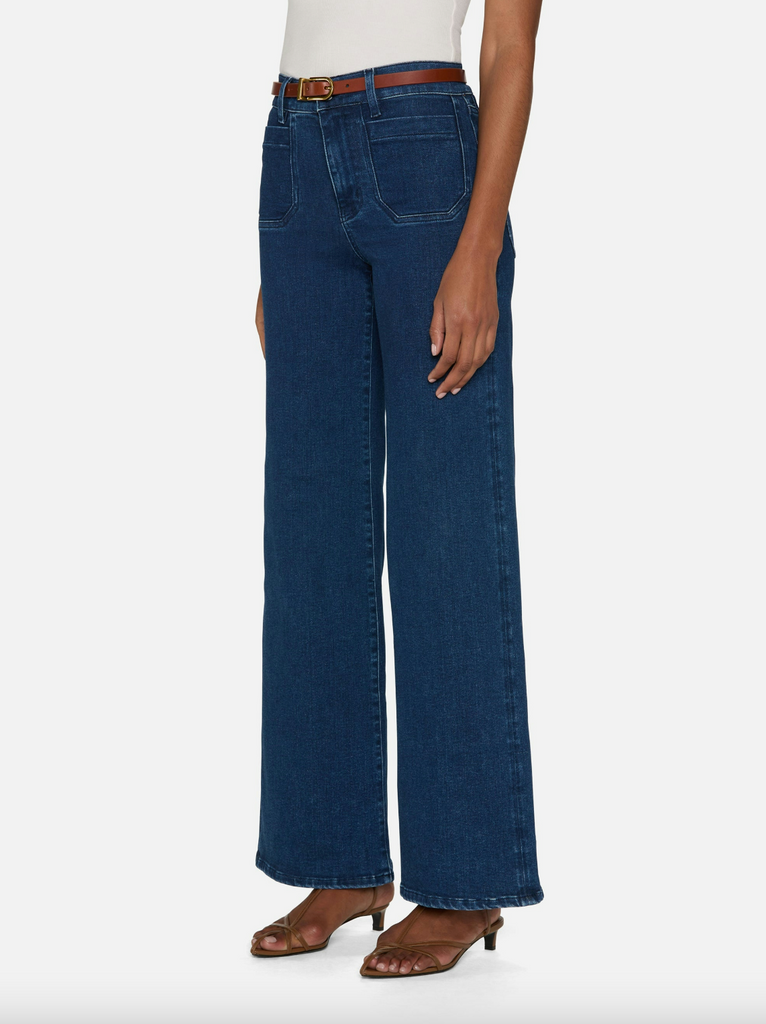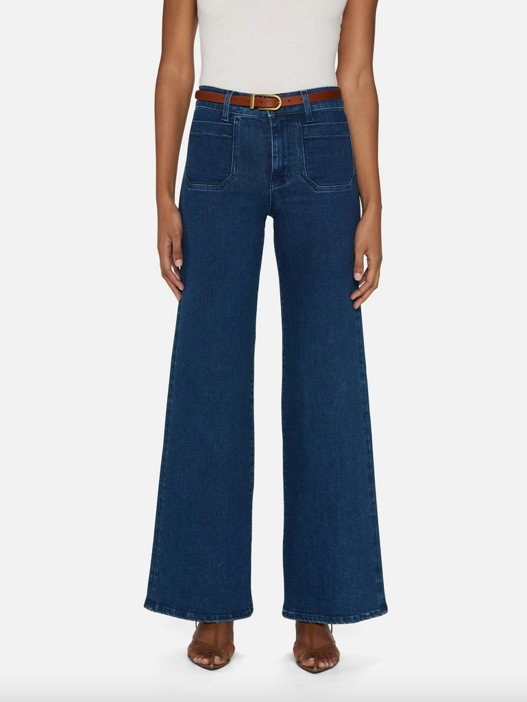 FRAME's best-selling palazzo silhouette, now with chic front pocket details. This pair has the same flattering high rise, fitted hip, and subtle wide-leg flare that hits at the floor. Crafted from a sustainable, ultra stretch cotton blend for soft and comfortable wear.