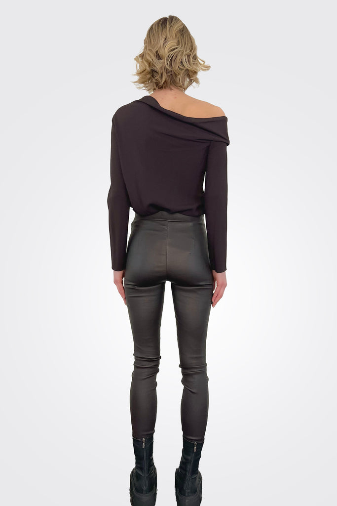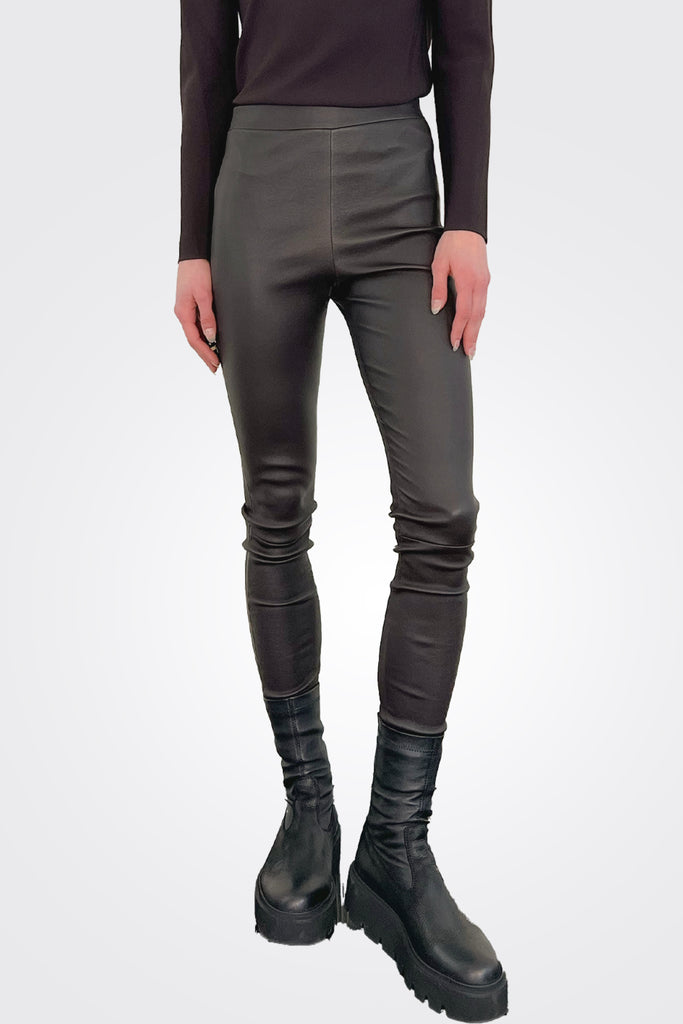 This skinny legging offers a streamlined look in a high-rise silhouette cut from premium stretch leather. Finished with a self-encased elastic waistband to achieve a clean finish, it’s detailed with chain-stitched hems to allow for easy wear.