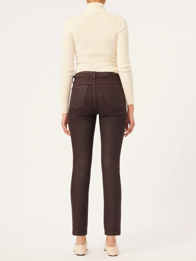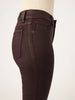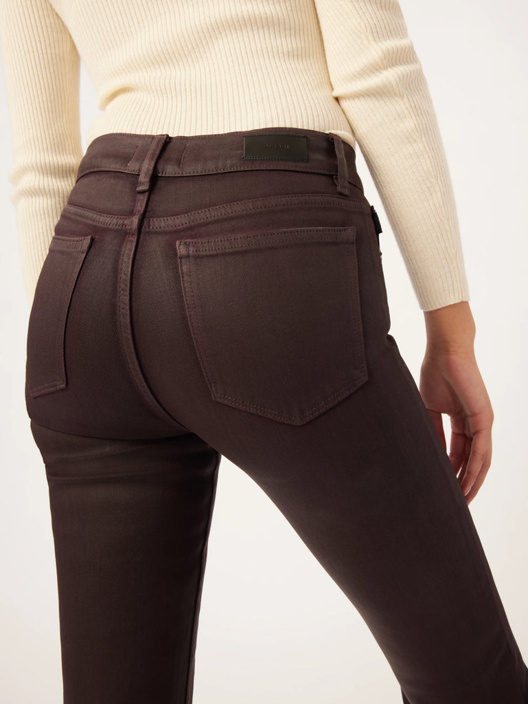 Aubergine is a wax coated dark and muted burgundy that combines the comfort of soft, stretch denim with a leather-like look. It features faux front pockets, black oxide hardware, tonal stitching, clean hem and a black back patch.