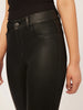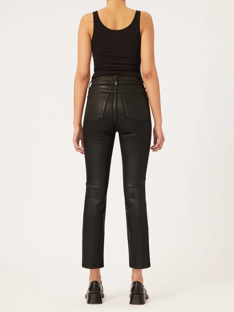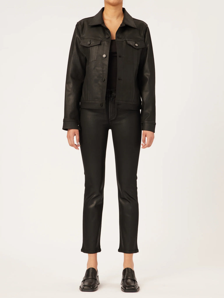 Black Coated is a wax coated, true black denim that combines the comfort of soft, stretch denim with a leather-like look. It features faux front pockets, tonal stitching, black oxide hardware and a clean hem.