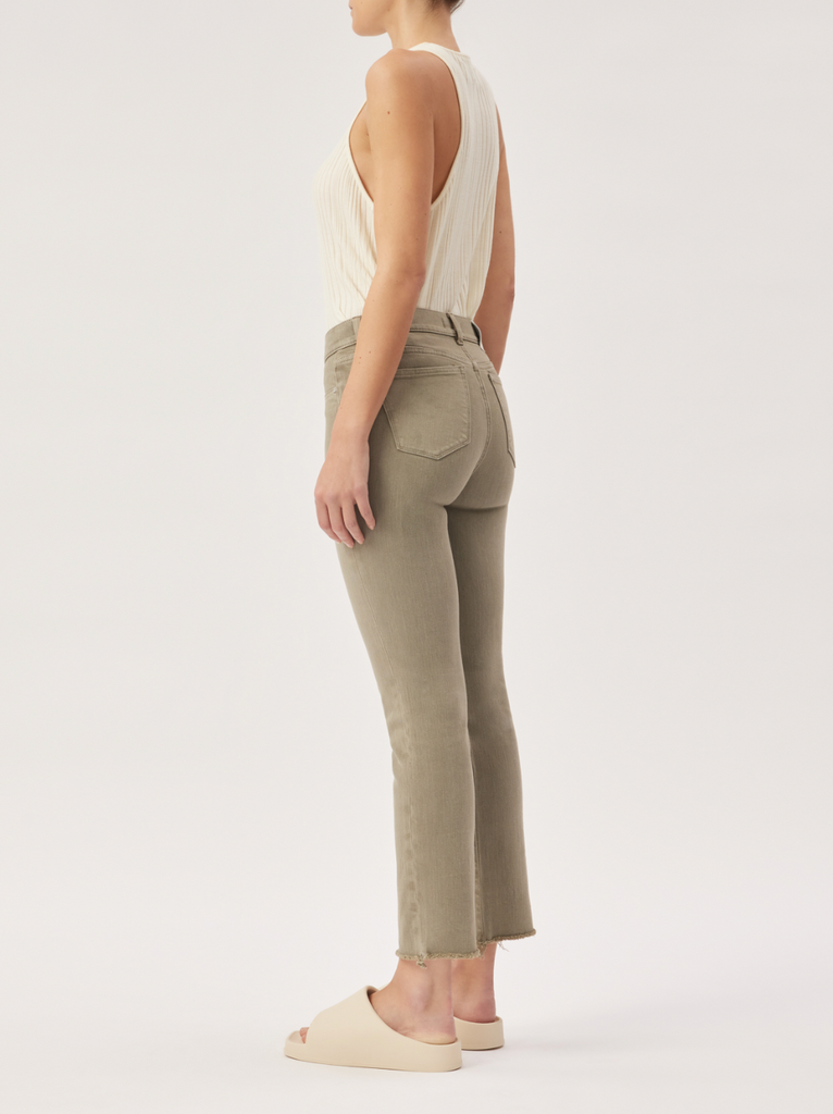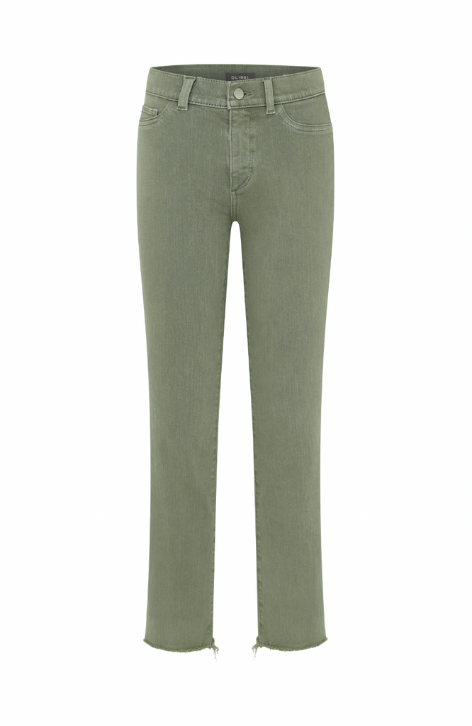 Lt. Coastal Plain is a vintage, soft green garment dye. It features faux front pockets, tonal stitching, matte silver hardware, raw hem with natural fray and an ecru back patch.