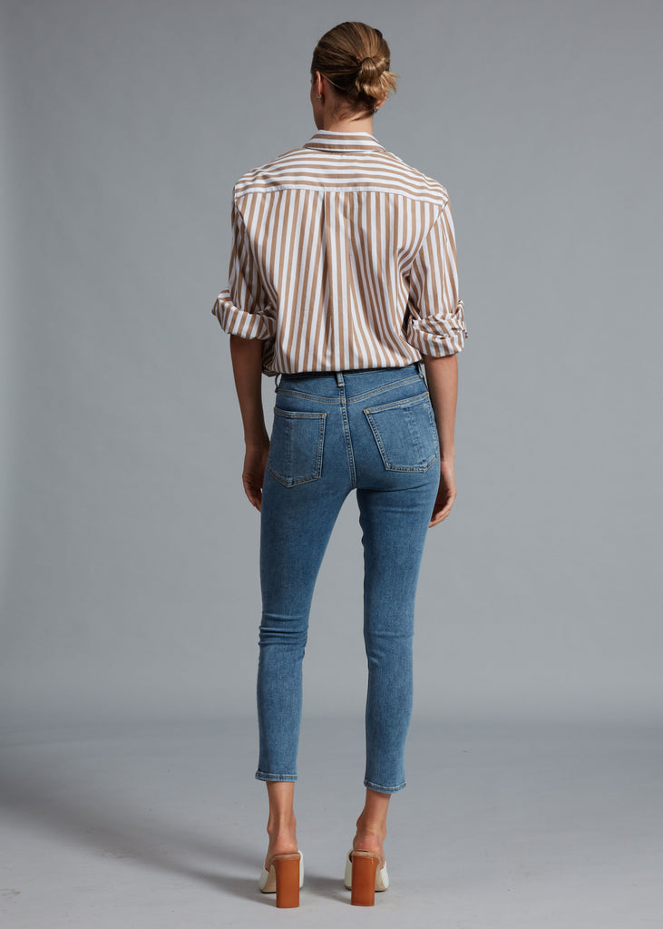 This Nina is a skinny fit jean with a high-rise and cropped inseam that sits just below the waist. Slim through hip and thigh, and crafted from high-quality Italian stretch denim in Mica. Clean, finished hem and a zip fly.