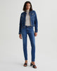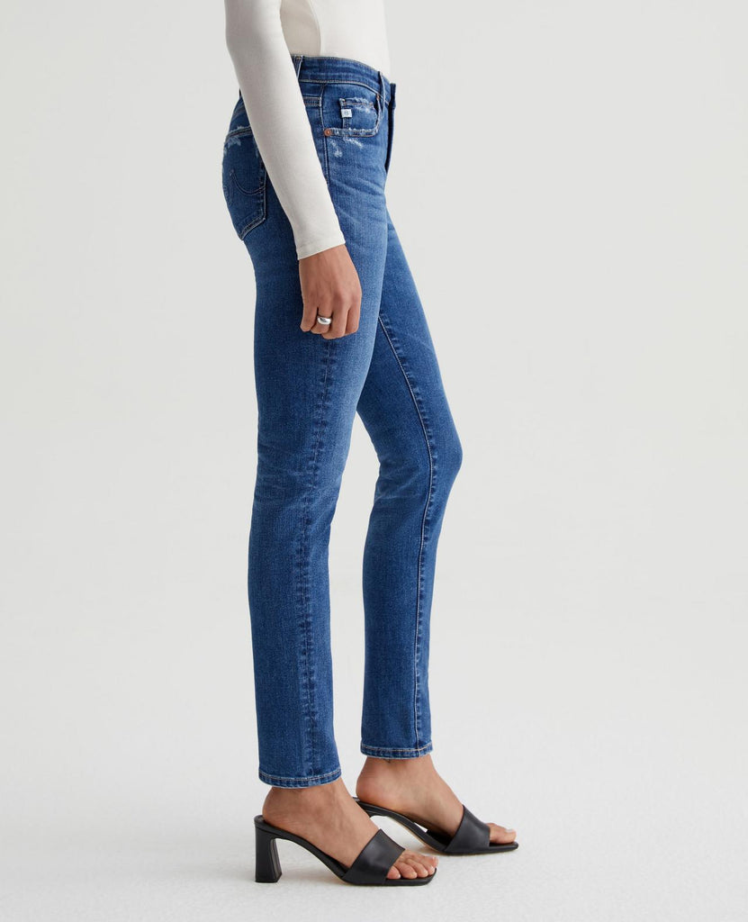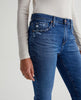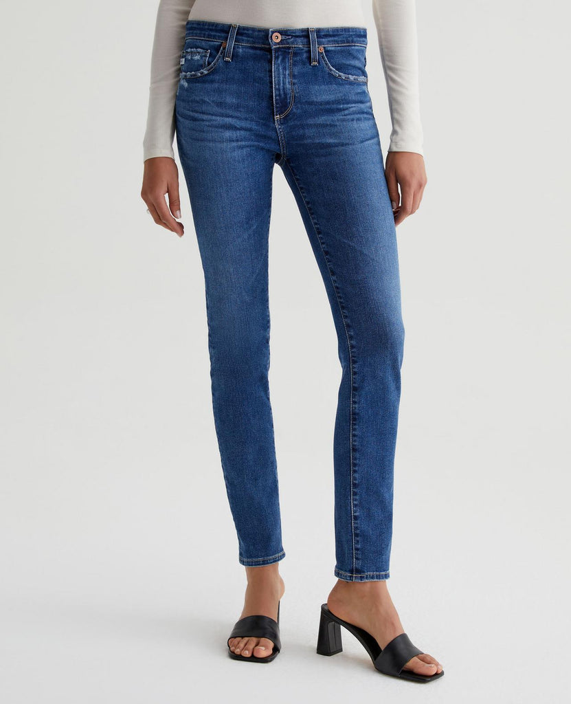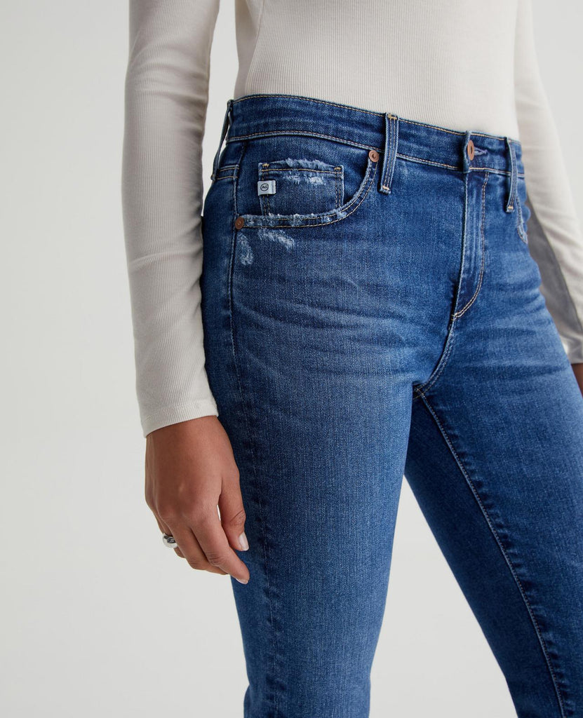 Prima cigarette jeans are featured here in a classic medium blue wash with a vintage fade and distressing at the pockets. Cut from 10 oz. Empower Denim, the style is fitted through the hips with slight tapering at the legs. It's blended with power stretch for a shape-hugging silhouette and premium recovery.