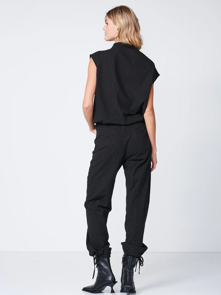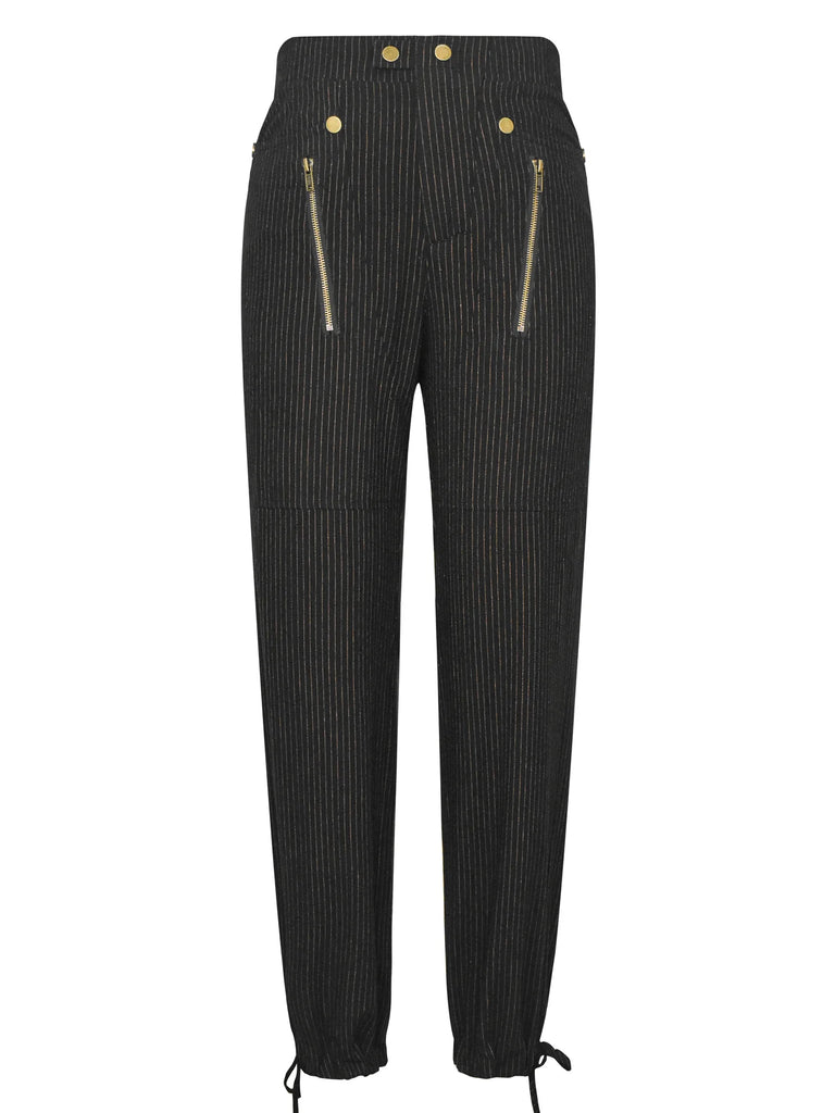 These pinstripe cargo pants are the perfect choice for a casual and modern wardrobe. The trousers have a slightly baggy fit, designed with drawstrings at the ankles to create a slightly oversized look. Style these trousers with the matching RICCI top for a trendy and refined set suitable for any occasion.